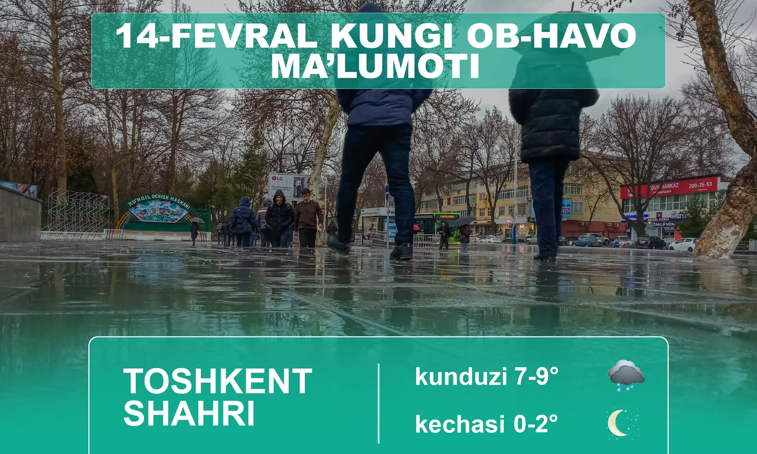 Ўзбекистон Республикаси Гидрометеорология хизмати агентлигининг хабар беришича, 14 февраль куни Тошкент шаҳрида ҳаво бироз булутли бўлади, бироз ёмғир ёғиши мумкин. Шамол ғарбдан 3-8 м/с тезликда эсади. Ҳарорат кечаси 0-2 даража илиқ, кундузи 7-9 даража илиқ бўлади.