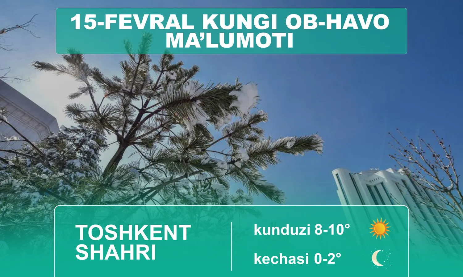 Ўзбекистон Республикаси Гидрометеорология хизмати агентлигининг хабар беришича, 15 февраль куни Тошкент шаҳрида ҳаво бироз булутли бўлади, ёғингарчилик кутилмайди. Шамол шарқдан 3-8 м/с тезликда эсади. Ҳарорат кечаси 0-2 даража илиқ, кундузи 8-10 даража илиқ бўлади.