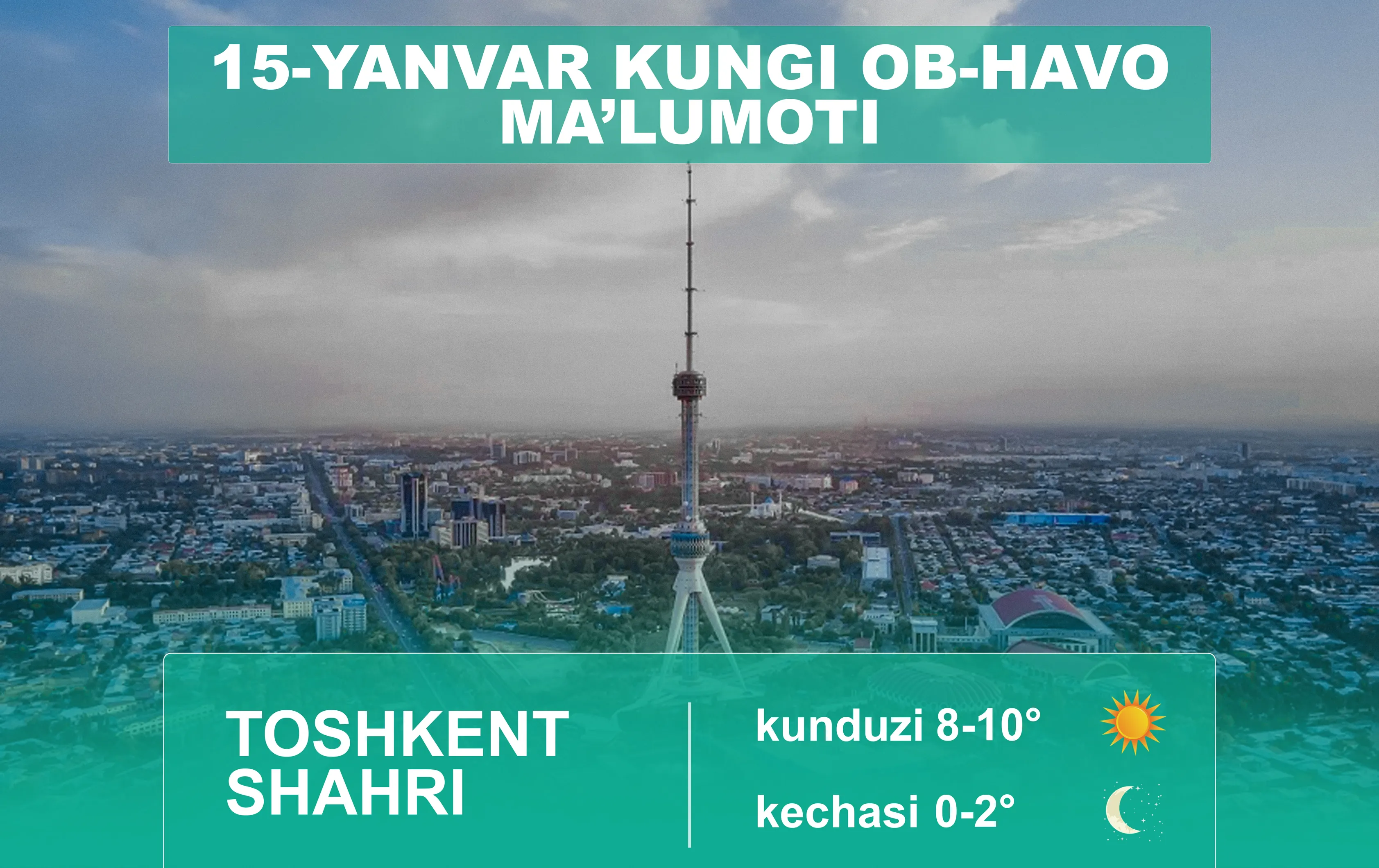 Ўзбекистон Республикаси Гидрометеорология хизмати агентлигининг хабар беришича, 15 январь куни Тошкент шаҳрида ҳаво бироз булутли бўлади, ёғингарчилик кутилмайди. Шамол шарқдан 3-8 м/с тезликда эсади. Ҳарорат кечаси 0-2 даража илиқ, кундузи 8-10 даража илиқ бўлади.