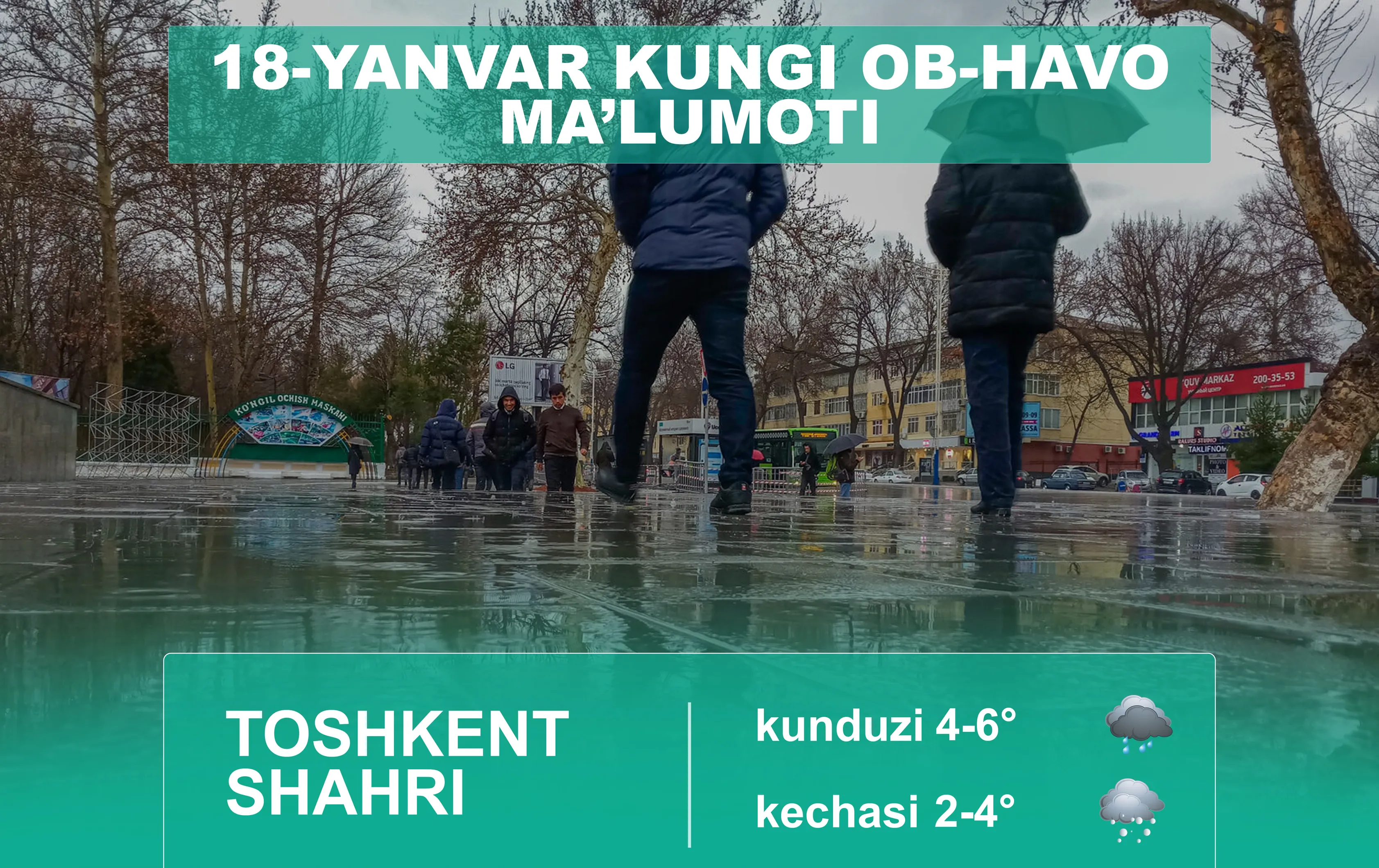Ўзбекистон Республикаси Гидрометеорология хизмати агентлигининг хабар беришича, 18 январь куни Тошкент шаҳрида ҳаво бироз булутли бўлади, вақти-вақти билан ёмғир ёғади, кечқурун қорга айланиши мумкин. Шамол ғарбдан 5-10 м/с тезликда эсади. Ҳарорат кечаси 2-4 даража илиқ, кундузи 4-6 даража илиқ бўлади.