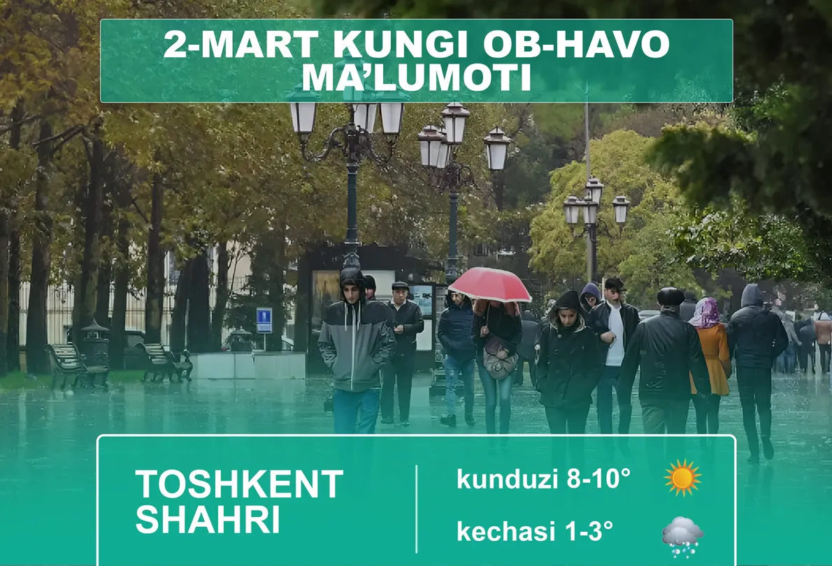 Ўзбекистон Республикаси Гидрометеорология хизмати агентлигининг хабар беришича, 2 март куни Тошкентда ҳаво ўзгариб туради, кечқурун ёғингарчилик бўлади (ёмғир, қор ёғади). Шарқдан эсаётган шамол ўз йўналишини ўзгартириб, ғарбдан секундига 3-8 метр тезликда эсади. Кечқурун шамолнинг тезлиги секундига 10-12 метргача кучайиши мумкин. Кечаси 1-3, кундузи 8-10 даража илиқ бўлади.