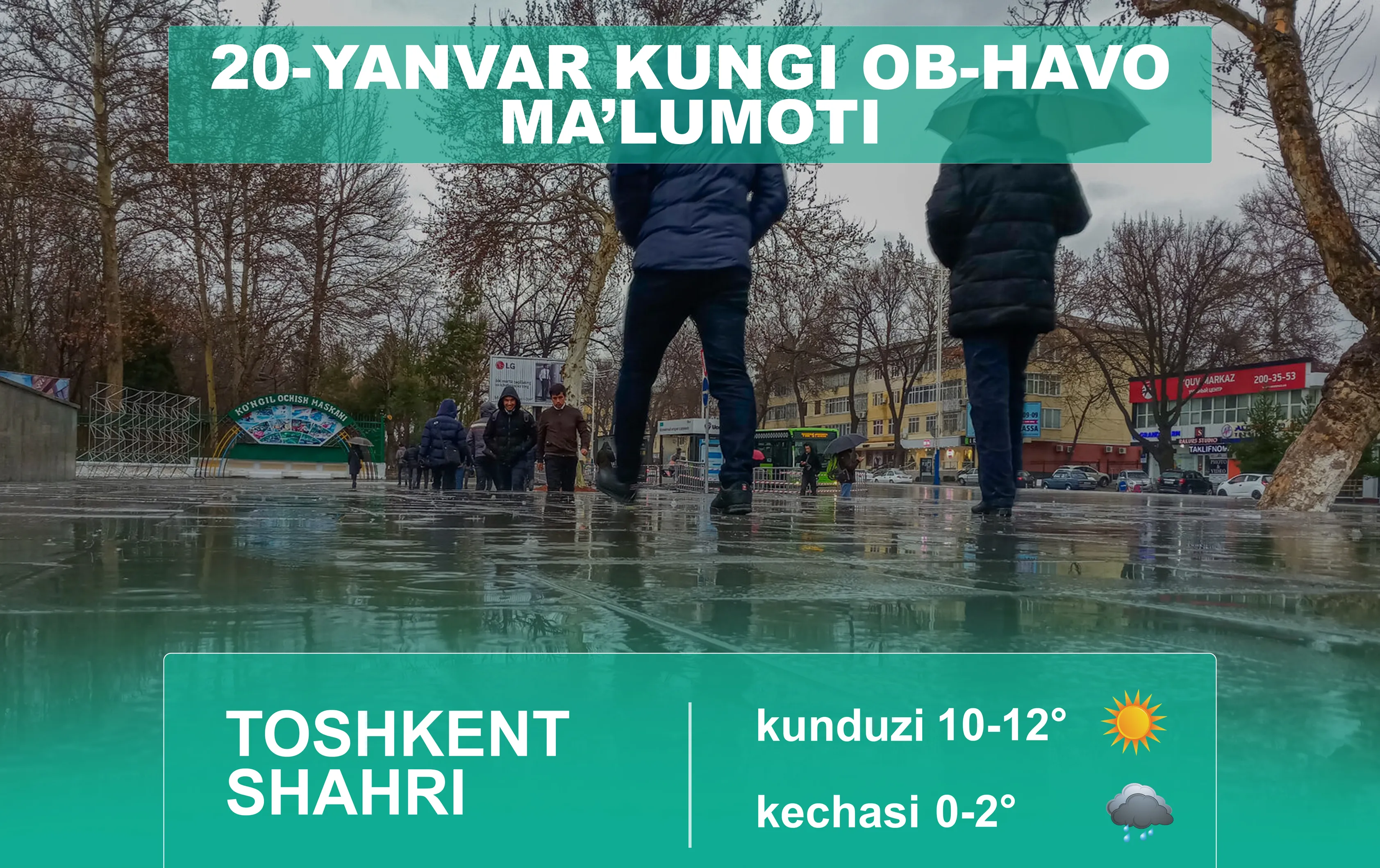 Ўзбекистон Республикаси Гидрометеорология хизмати агентлигининг хабар беришича, 20 январь куни Тошкент шаҳрида ҳаво бироз булутли бўлади, кечқурун бироз ёмғир ёғиши мумкин. Кечаси ва эрталаб туман тушиши мумкин. Шамол ғарбдан 5-10 м/с тезликда эсади. Ҳарорат кечаси 0-2 даража илиқ, кундузи 10-12 даража илиқ бўлади.