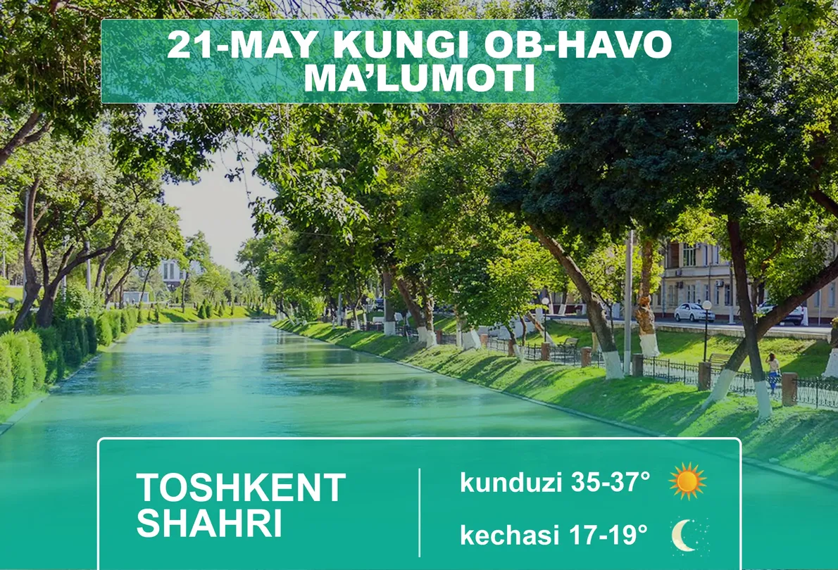 Ўзбекистон Республикаси Гидрометеорология хизмати агентлигининг хабар беришича, 21-май куни Тошкент шаҳрида ҳаво бироз булутли бўлади, ёғингарчилик кутилмайди. Шамол шарқдан 3-8 м/с тезликда эсади. Ҳарорат кечаси 17-19 даража, кундузи 35-37 даража бўлади.