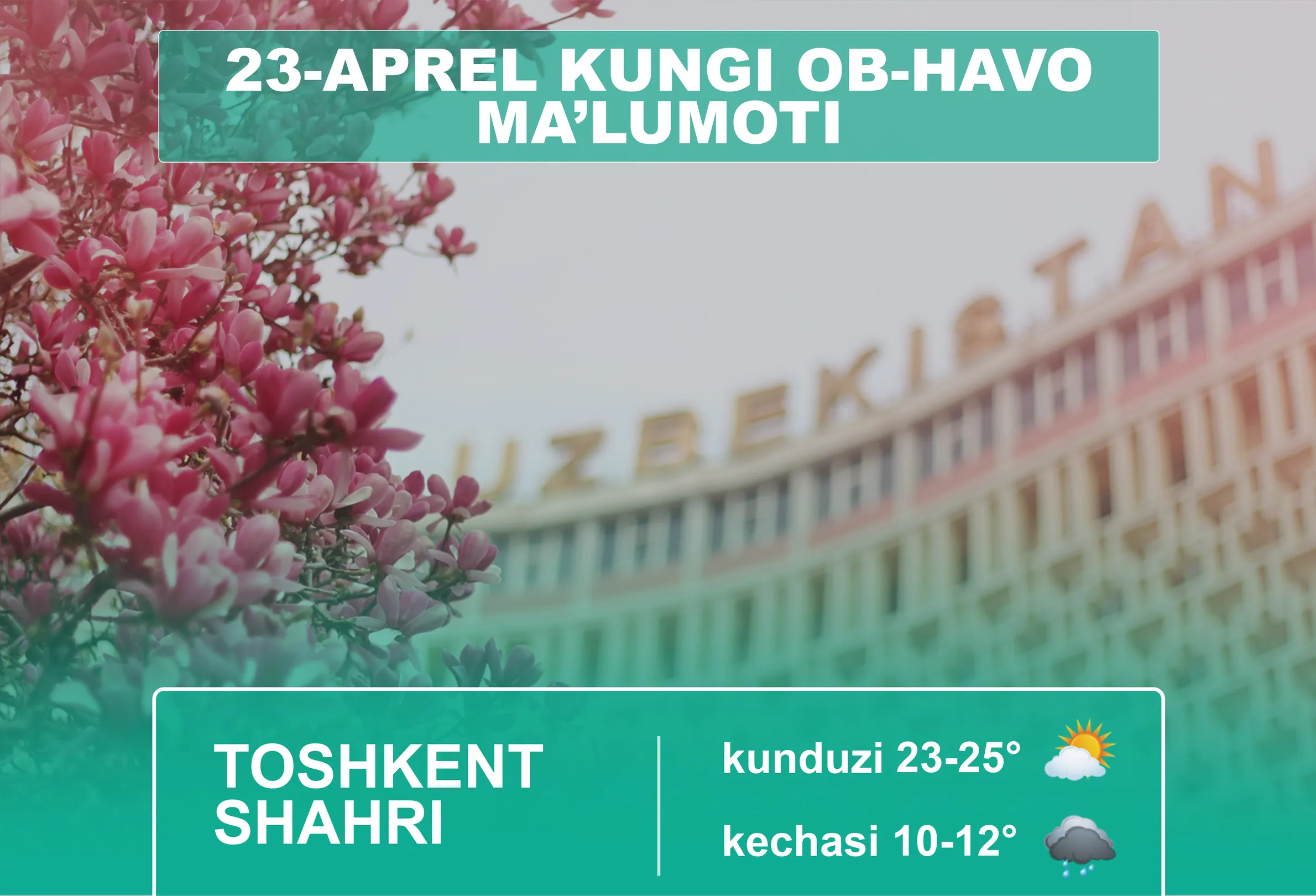 Ўзбекистон Республикаси Гидрометеорология хизмати агентлигининг хабар беришича, 23 апрель куни Тошкент шаҳрида ҳаво бироз булутли бўлади, куннинг иккинчи ярмида бироз қисқа муддатли ёмғир ёғиши, момақалдироқ бўлиши мумкин. Шамол шарқдан 3-8 м/с тезликда эсади. Ҳарорат кечаси 10-12 даража, кундузи 23-25 даража бўлади.
