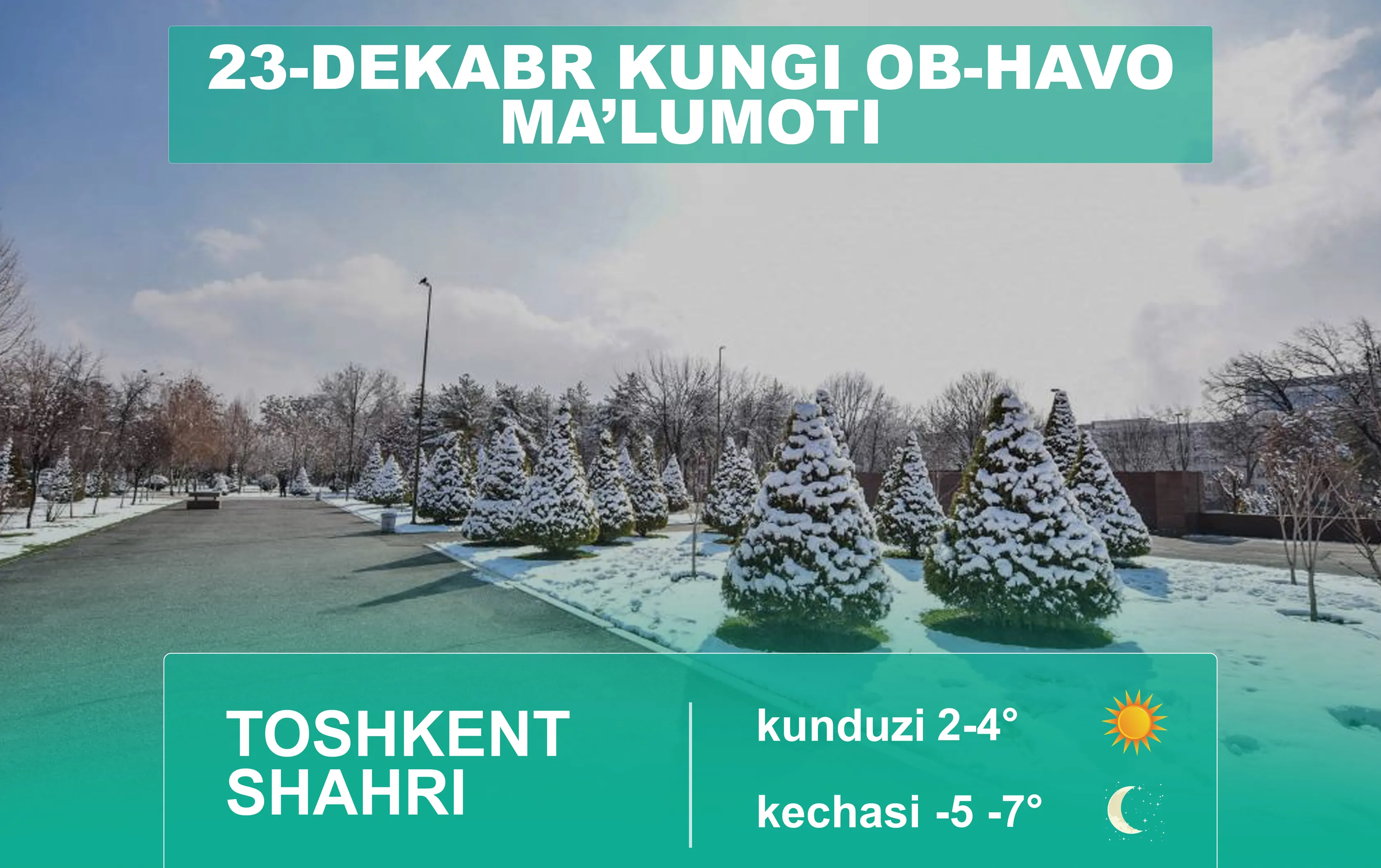 Ўзбекистон Республикаси Гидрометеорология хизмати агентлигининг хабар беришича, 23 декабрь куни Тошкентда ҳаво ўзгариб туради, ёғингарчилик бўлмайди. Кечаси ва эрталаб туман тушиши мумкин. Шарқдан секундига 3-8 метр тезликда шамол эсади. Кечаси 5-7 даража совуқ, кундузи 2-4 даража илиқ бўлади.