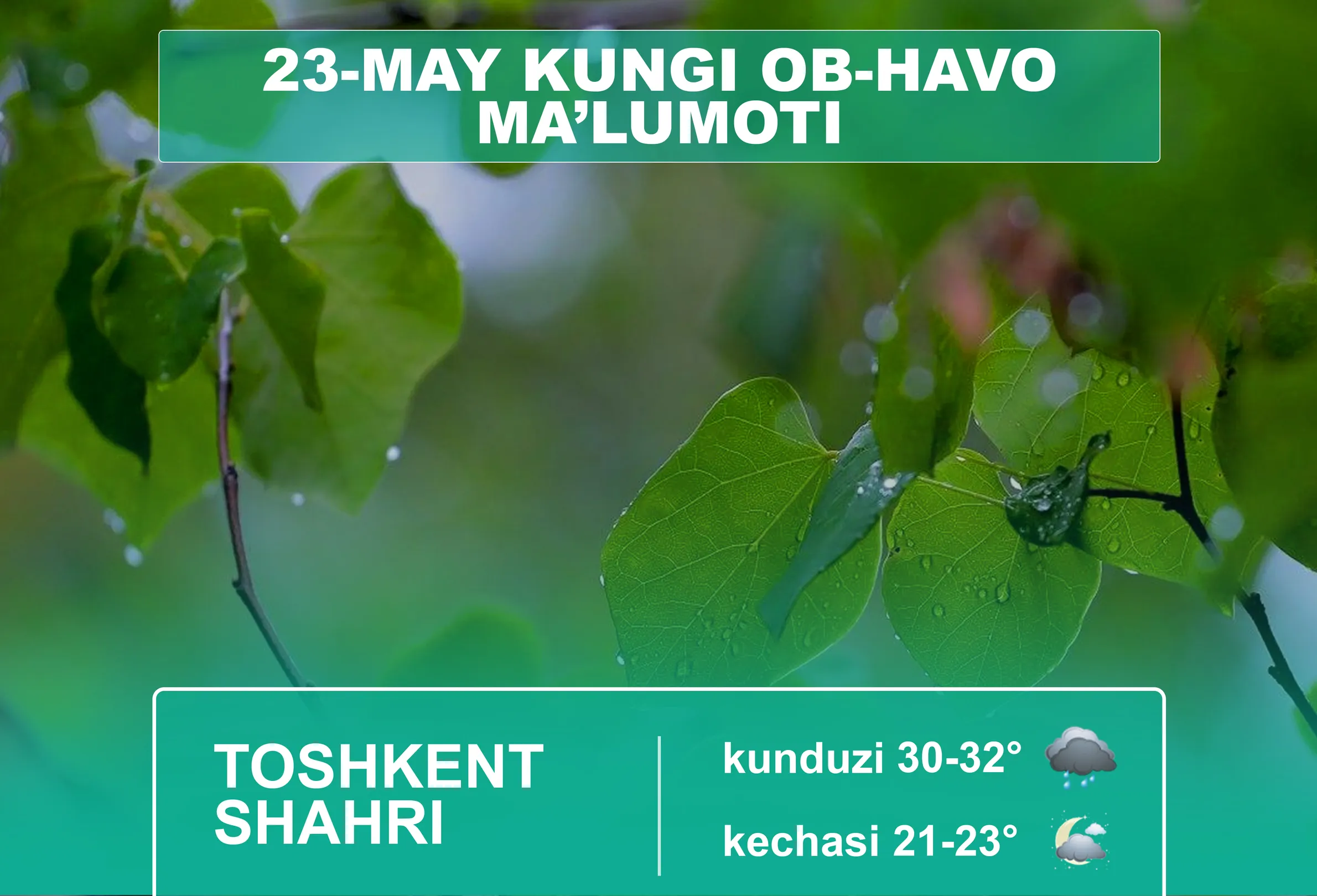Ўзбекистон Республикаси Гидрометеорология хизмати агентлигининг хабар беришича, 23-май куни Тошкент шаҳрида ҳаво бироз булутли, вақти-вақти билан ўзгарувчан бўлади, куннинг биринчи ярмида бироз қисқа муддатли ёмғир ёғиши, момақалдироқ бўлиши мумкин. Шамол ғарбдан 3-8 м/с тезликда эсади, 12-15 м/с гача кучайиши, баъзи жойларда чанг-тўзонлар билан кузатилиши мумкин. Ҳарорат кечаси 21-23 даража, кундузи 30-32 даража бўлади.
