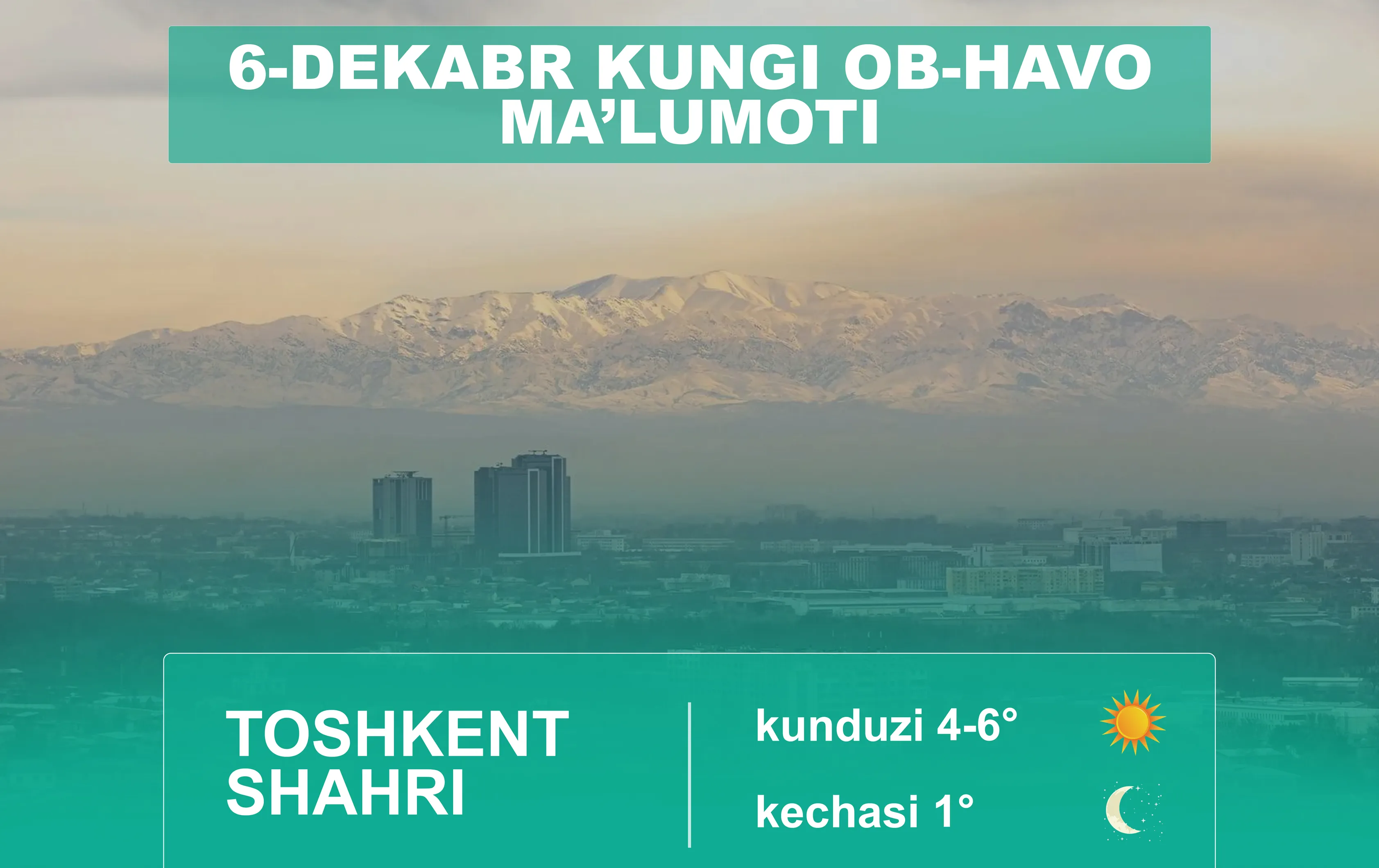 Ўзбекистон Республикаси Гидрометеорология хизмати агентлигининг хабар беришича, 6 декабрь куни Тошкент шаҳрида ҳаво бироз булутли бўлади, ёғингарчилик кутилмайди. Туман тушиши мумкин. Шамол шарқдан 3-8 м/с тезликда эсади. Ҳарорат кечаси 1, кундузи 4-6 даража илиқ бўлади.
