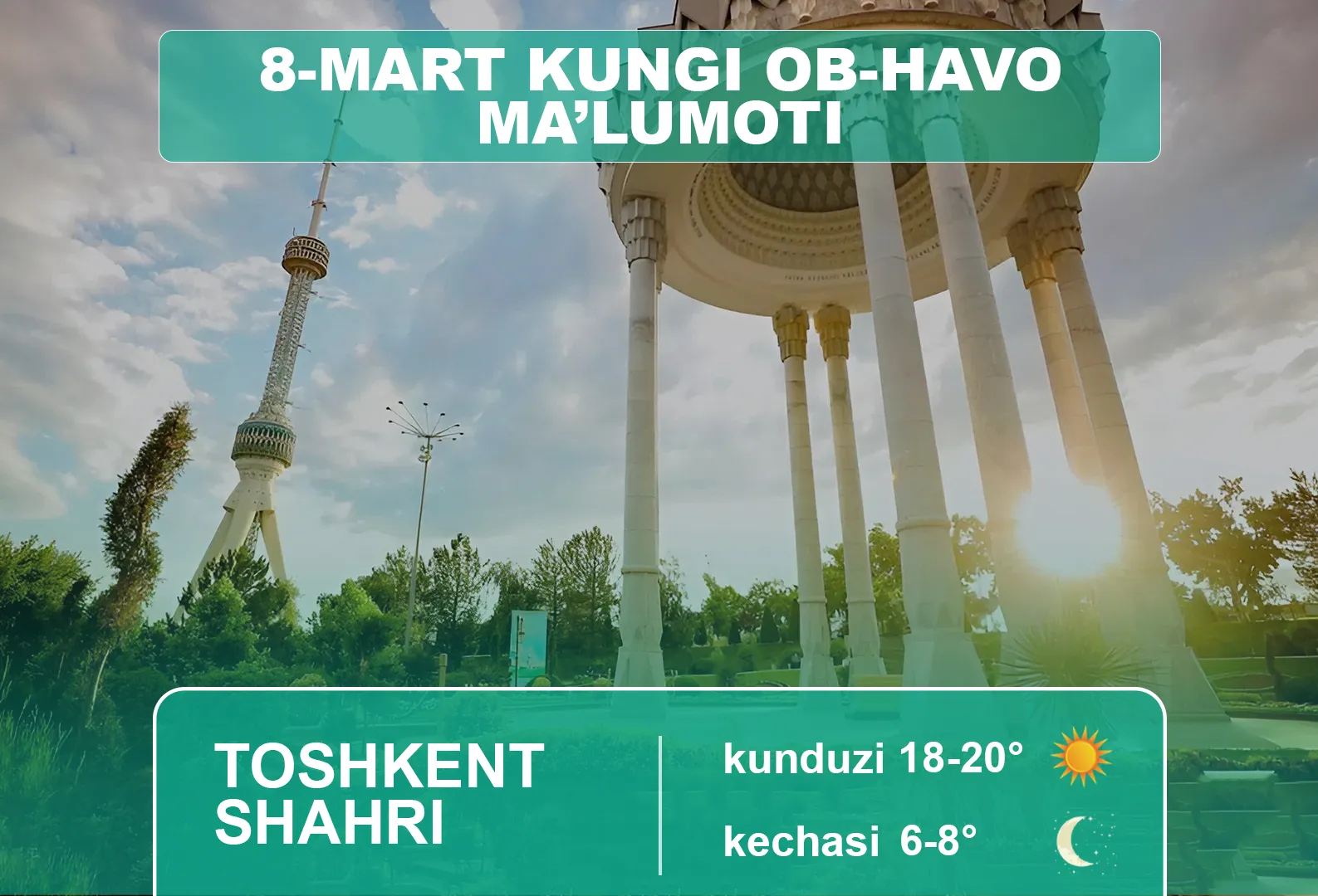 Тошкент, Сирдарё, Жиззах, Самарқанд вилоятларида ҳаво ўзгарувчан бўлади, ёғингарчилик кутилмайди. Шамол ўзгарувчан йўналишда 7–12 м/с тезликда эсади. Ҳарорат кечаси 5–10° илиқ, кундузи 15–20° илиқ бўлади.