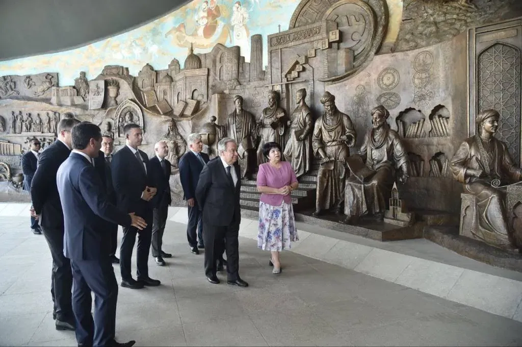 БМТ Бош котиби “Янги Ўзбекистон” боғидаги Мустақиллик монументи пойига гул қўйди. Мажмуа билан қисқача танишув асносида БМТ делегацияси вакилларига мазкур ансамбль мазмуни ва меъморий ечимлари ҳақида маълумот берилди. Бу мажмуа 2021 йилда, истиқлолимизнинг ўттиз йиллигига бағишлаб бунёд этилган эди.