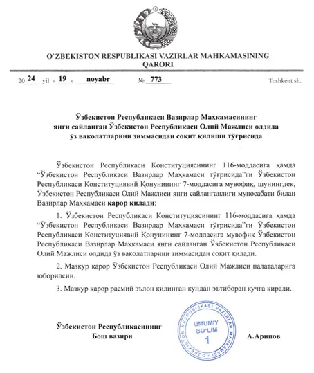 Шу муносабат билан, жорий йилнинг 19 ноябрь куни Вазирлар Маҳкамасининг тегишли қарорига кўра амалдаги Ҳукумат янги сайланган Олий Мажлис олдида ваколатларини зиммасидан соқит қилди.