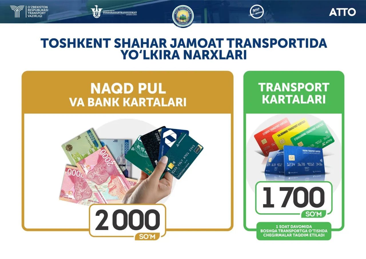 Қайд этилишича, бунда нақд пул шаклида ёки банк карталарти орқали тўлов қилувчиларга йўл ҳақи 2 000 сўмдан, АТТО транспорт карталаридан фойдалаунвчиларга эса 1 700 сўмдан тушади.