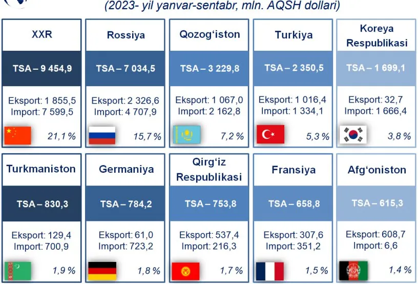 Статистика агентлигининг дастлабки маълумотларига кўра, 2023 йилнинг январ-сентябр ойларида Ўзбекистон Республикаси ташқи савдо айланмасида юқори улушга эга бўлган ҳамкор давлатлар(АҚШ долларида):