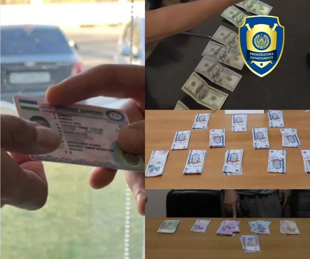 Бош прокуратура ҳузуридаги Департаментнинг Қораўзак туман бўлими томонидан ИИВ ходимлари билан ҳамкорликда ўтказилган тезкор тадбирларда фуқаролар Б.Б. (муқаддам судланган) ва Б.Ш. фуқаролар У.А. ва Д.У.ни ҳайдовчилик гувоҳномасини олиш учун имтиҳондан ўтказиб бериш эвазига жами 11 млн сўмни олган вақтларида ашёвий далиллар билан ушланган.