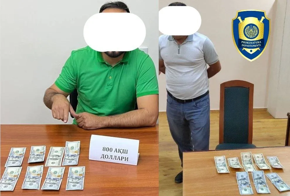 Бош прокуратура ҳузуридаги Департамент ҳамда ДХХнинг Юнусобод тумани бўлимлари томонидан ўтказилган тезкор тадбирда, фуқаро Б.А. фуқаро Н.К. га гўёки юқори лавозимда ишловчи танишлари ёрдамида ўқув машғулотларига қатнашмасдан ҳайдовчилик гувоҳномасини олиб бериши эвазига 800 АҚШ долларини олган вақтида ашёвий далиллар билан ушланган.