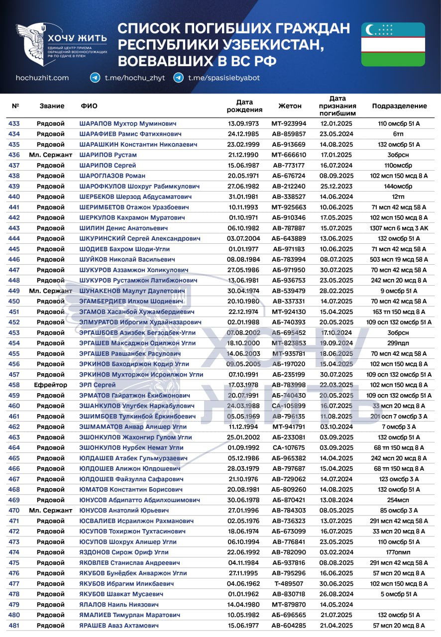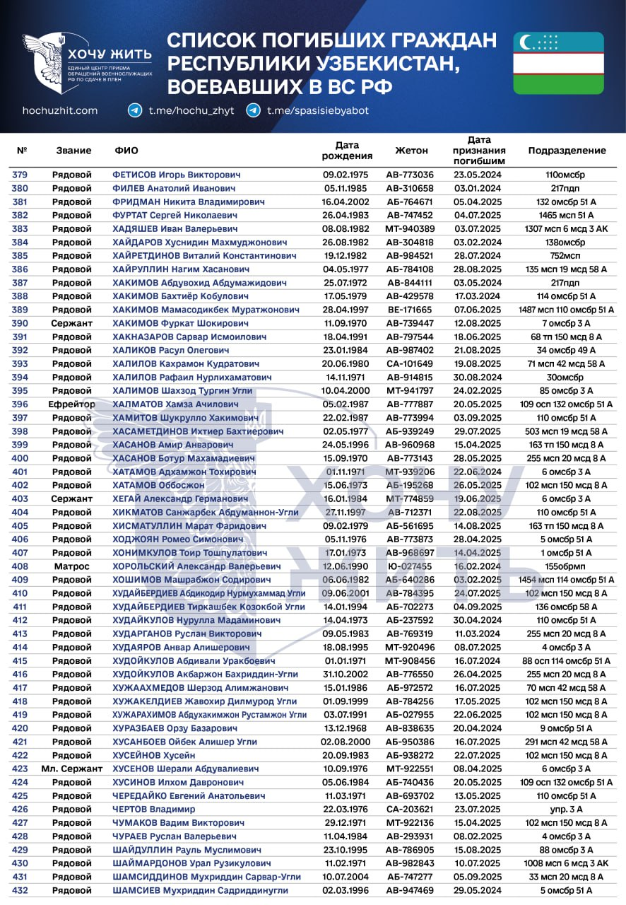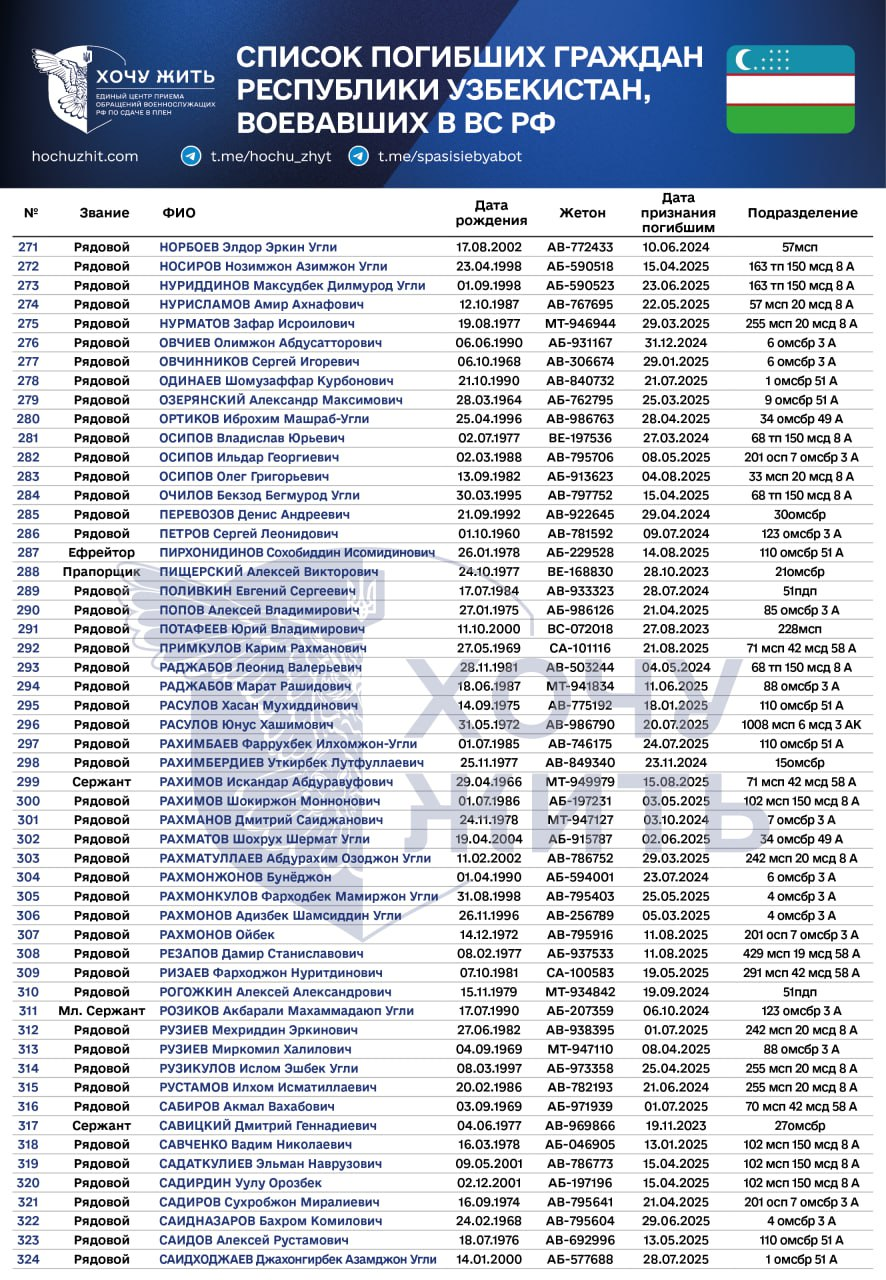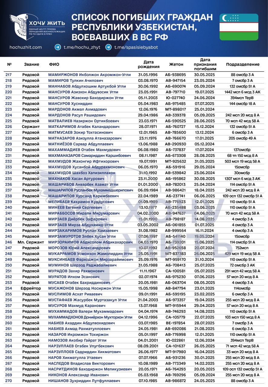“Хочу жит” (яшашни истайман) ташкилоти Украинадаги урушда Россия армияси сафида жанг қилган, ҳалок бўлган ёки бедарак йўқолган ўзбекистонлик фуқароларнинг янги рўйхатини эълон қилди.