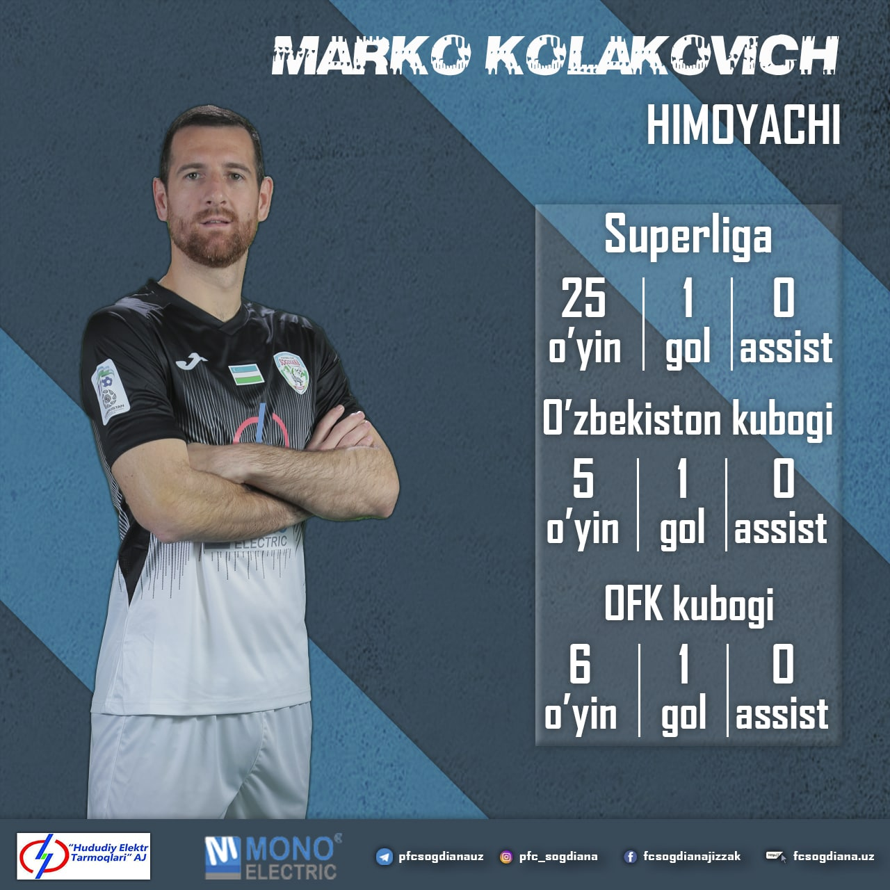 Маълумот учун Марко Колакович ортда қолган футбол мавсумида жами 36 та ўйинда майдонга тушиб, 2 та гол уришга эришган.