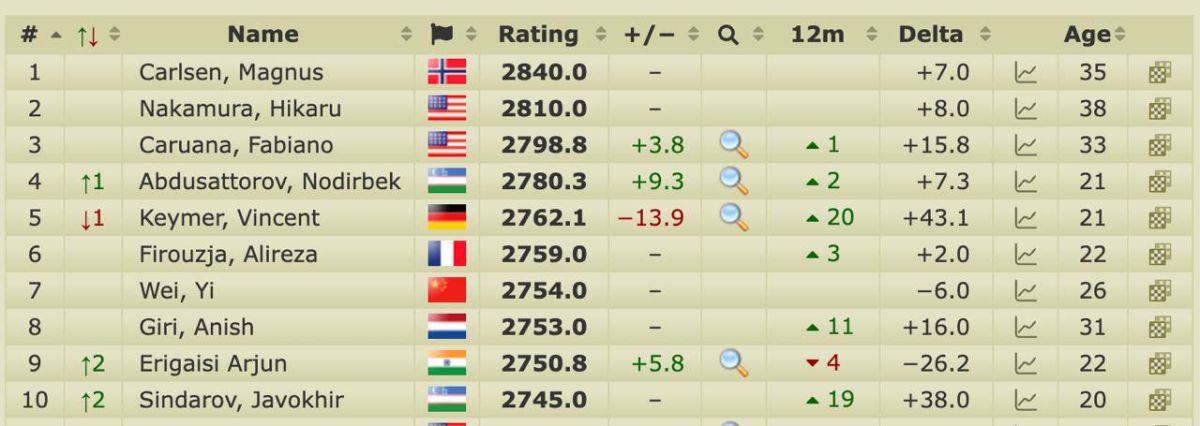 Классик шахмат бўйича live рейтингида икки ўзбекистонлик гроссмейстер дунёнинг Топ-10'талигига кирди.