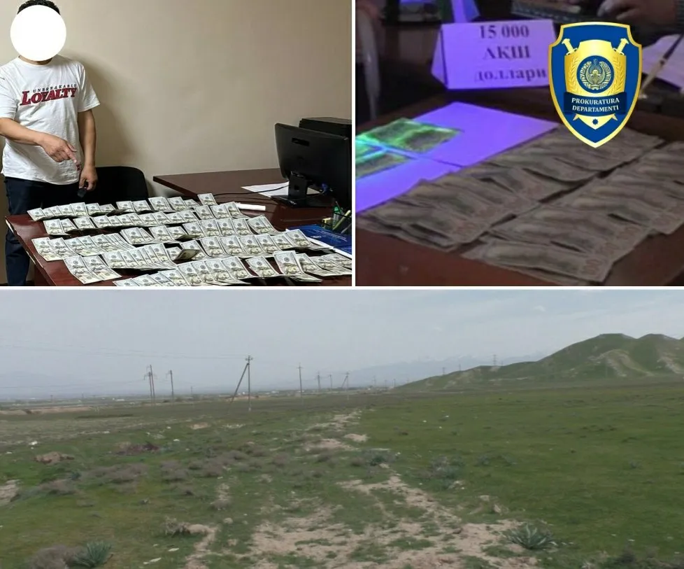 Бош прокуратура ҳузуридаги Департаментнинг Оҳангарон туман бўлими томонидан ИИВ ходимлари билан ҳамкорликда ўтказилган тезкор тадбирда, фуқаро Р.Х. Юқоричирчиқ тумани, “Бирлик” МФЙ ҳудудидаги “Р.Т.” МЧЖга қарашли 7,8 гектар ер майдонини фуқаро М.Х. га 144 000 АҚШ долларига сотишга келишиб, гўёки юқори лавозимда ишловчи танишлари ёрдамида ер майдони кадастр ҳужжатларини расмийлаштириб бериши эвазига олдиндан 10 000 АҚШ долларини олган вақтида ашёвий далиллар билан ушланган.