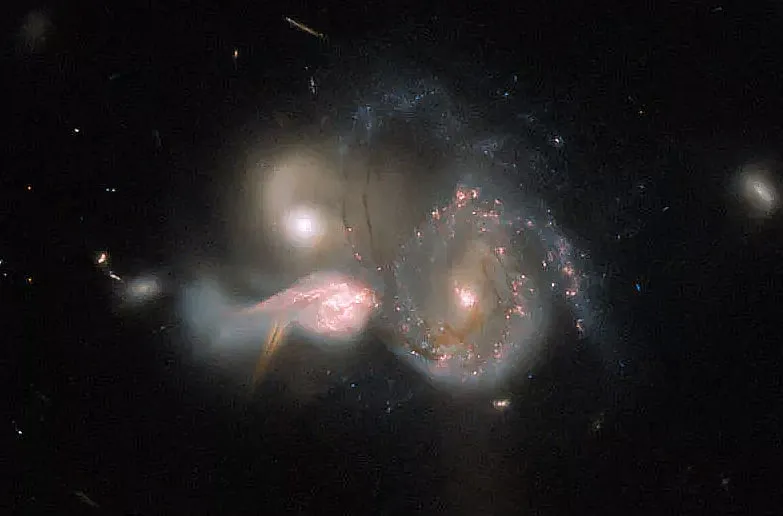 Олимларнинг таъкидлашича, ҳар учала галактиканинг шакллари аллақачон бузилган, уларни боғлаб турган газ ва чанг филаментлари (тўплам) кўринади ҳамда улар ўзидан катта миқдорда ёруғлик чиқаради – буларнинг барчаси яқинлашиб келаётган тўқнашувга ишора қилади.