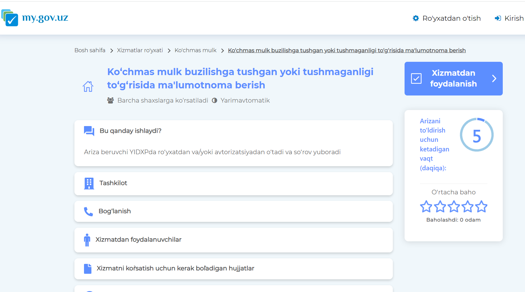 Письмо о том, что жилье нарушено или не уменьшено, доступно для доступа в Интернет через my.gov.uz.Это было объявлено Министерством ИКТ. Достаточно написать кадастровый номер и строительство в пустые ячейки для этого, выбрав «выдачу сертификата об отказе». Эта услуга оплачивается, и при использовании My.gov.uz.Период обслуживания составляет 3 дня.