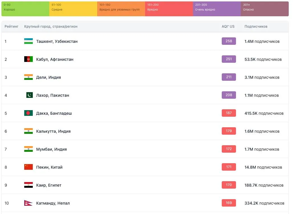 IQAir portaliga ko‘ra, poytaxt havosida PM 2.5 zarrachalari miqdori JSST tavsiya qilganidan 37.1 baravar ortib ketgan. Havo sifati “xavfli” toifada turibdi.