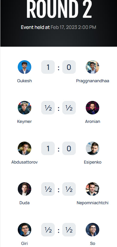 Avval xabar berilganidek, Germaniyaning Dyusseldorf shahrida shaxmat boʻyicha mukofot jamgʻarmasi 130 ming yevroni tashkil etgan “WR Chess Masters” turnirining 2-tur bahslarida hamyurtimiz Nodirbek Abdusattorov rossiyalik shaxmatchi Andrey Yesipenkoga qarshi dona surdi.