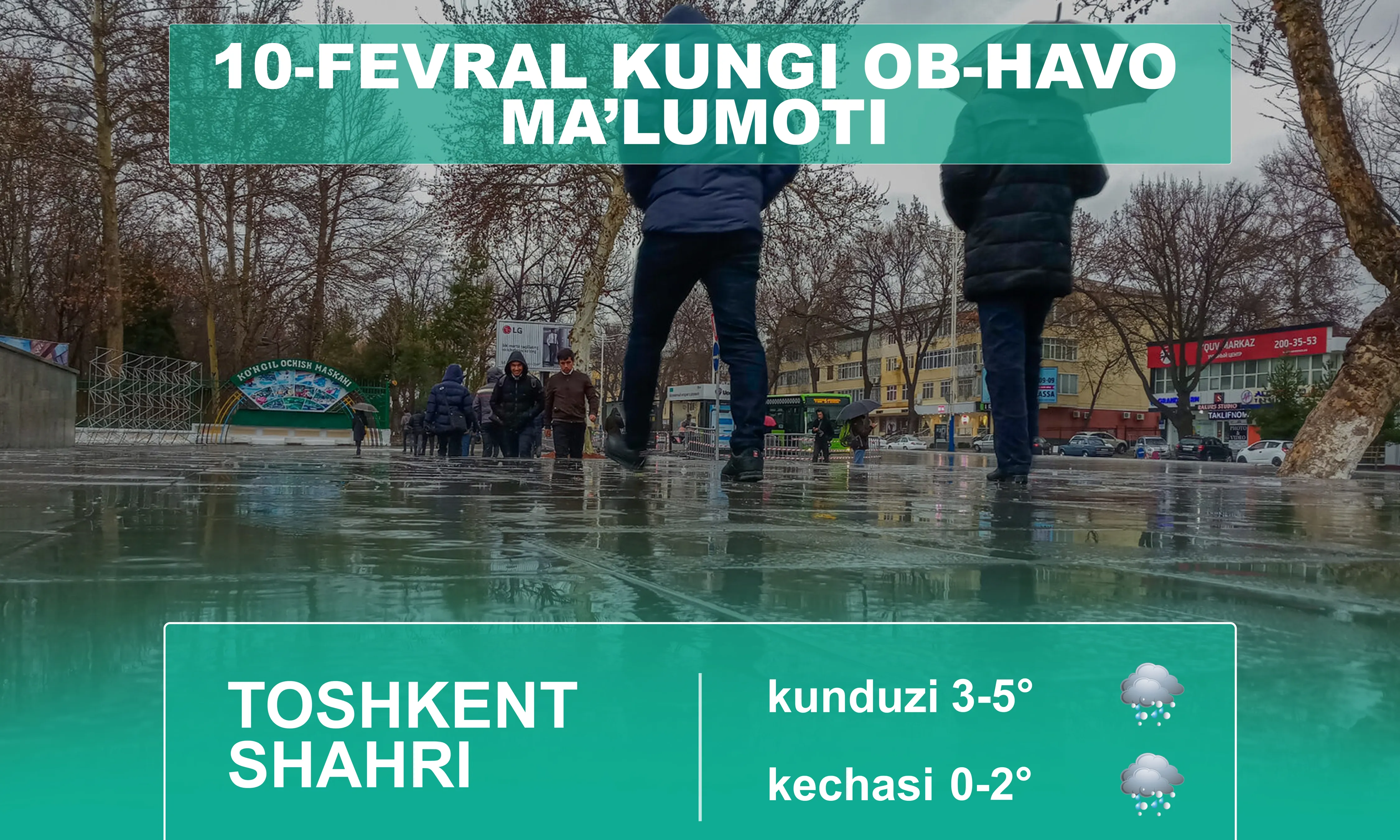 O‘zbekiston Respublikasi Gidrometeorologiya xizmati agentligining xabar berishicha, 10-fevral kuni Toshkent shahrida havo biroz bulutli bo‘ladi, kechqurun yog’ingarchilik (yomg’ir, qor) bo’lishi mumkin. Shamol g’arbdan 3-8 m/s tezlikda esadi. Harorat kechasi 0-2 daraja iliq, kunduzi 3-5 daraja iliq bo‘ladi.