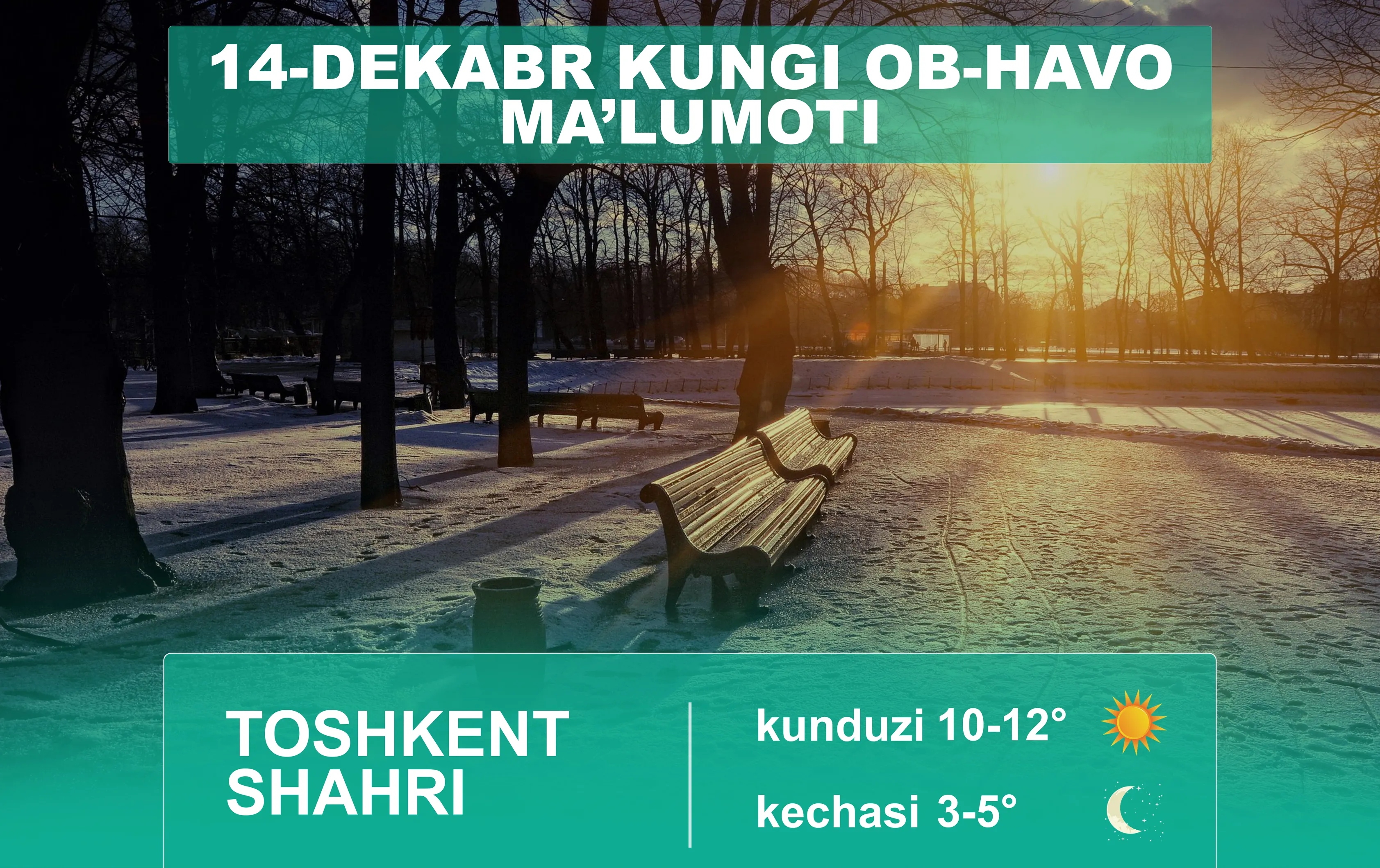 O‘zbekiston Respublikasi Gidrometeorologiya xizmati agentligining xabar berishicha, 14-dekabr kuni Toshkent shahrida havo biroz bulutli bo‘ladi, kechga tomon biroz yomg‘ir yog‘ishi mumkin. Shamol sharqdan 5-10 m/s tezlikda esadi. Harorat kechasi 3-5, kunduzi 10-12 daraja iliq bo‘ladi.