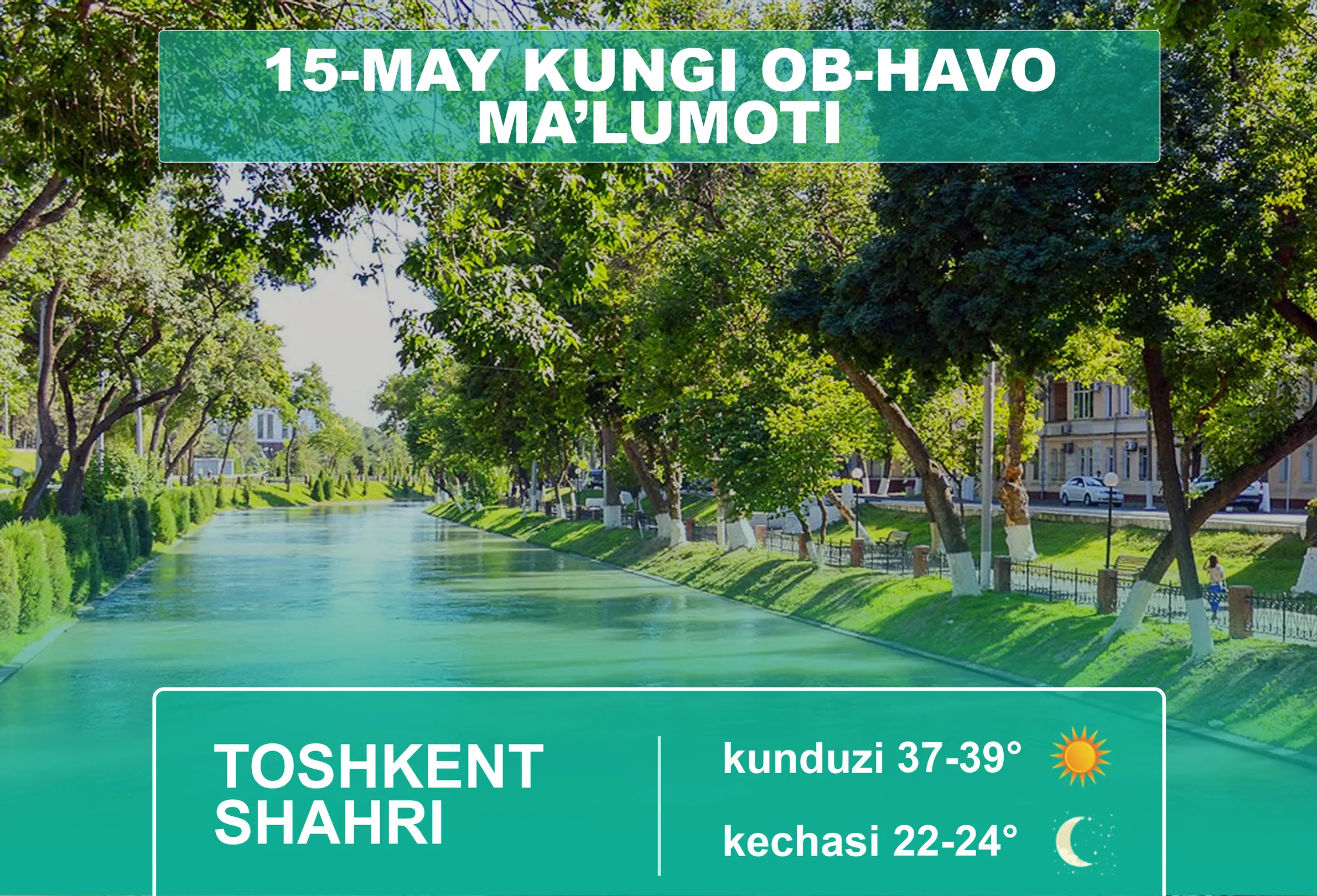 O‘zbekiston Respublikasi Gidrometeorologiya xizmati agentligining xabar berishicha, 15-may kuni Toshkent shahrida havo biroz bulutli bo‘ladi, yog‘ingarchilik kutilmaydi. Shamol sharqdan 3-8 m/s tezlikda esadi. Harorat kechasi 22-24, kunduzi 37-39 daraja bo‘ladi.