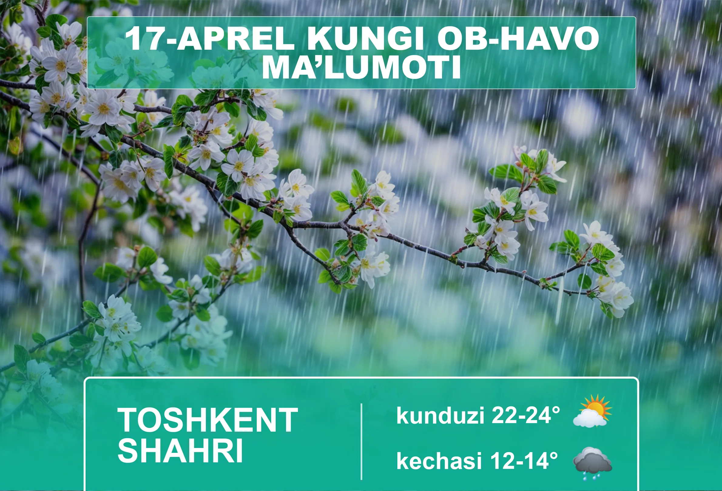 O‘zbekiston Respublikasi Gidrometeorologiya xizmati agentligining xabar berishicha, 17-aprel kuni Toshkent shahrida havo biroz bulutli bo‘ladi, kunning ikkinchi yarmida yomg‘ir yog‘adi, momaqaldiroq bo‘lishi mumkin. Shamol g‘arbdan 5-10 m/s tezlikda esadi, 12-15 m/s gacha kuchayishi mumkin. Harorat kechasi 12-14 daraja, kunduzi 22-24 daraja bo‘ladi.