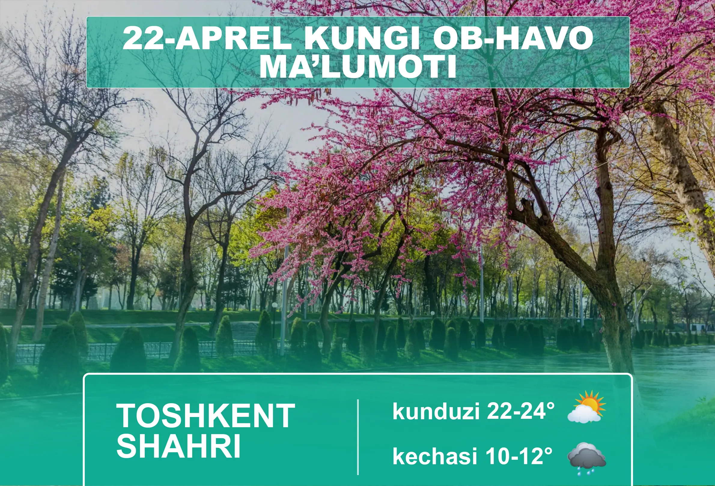 O‘zbekiston Respublikasi Gidrometeorologiya xizmati agentligining xabar berishicha, 22-aprel kuni Toshkent shahrida havo biroz bulutli bo‘ladi, kunning ikkinchi yarmida biroz qisqa muddatli yomg‘ir yog‘ishi, momaqaldiroq bo‘lishi mumkin. Shamol sharqdan 3-8 m/s tezlikda esadi. Harorat kechasi 10-12 daraja, kunduzi 22-24 daraja bo‘ladi.