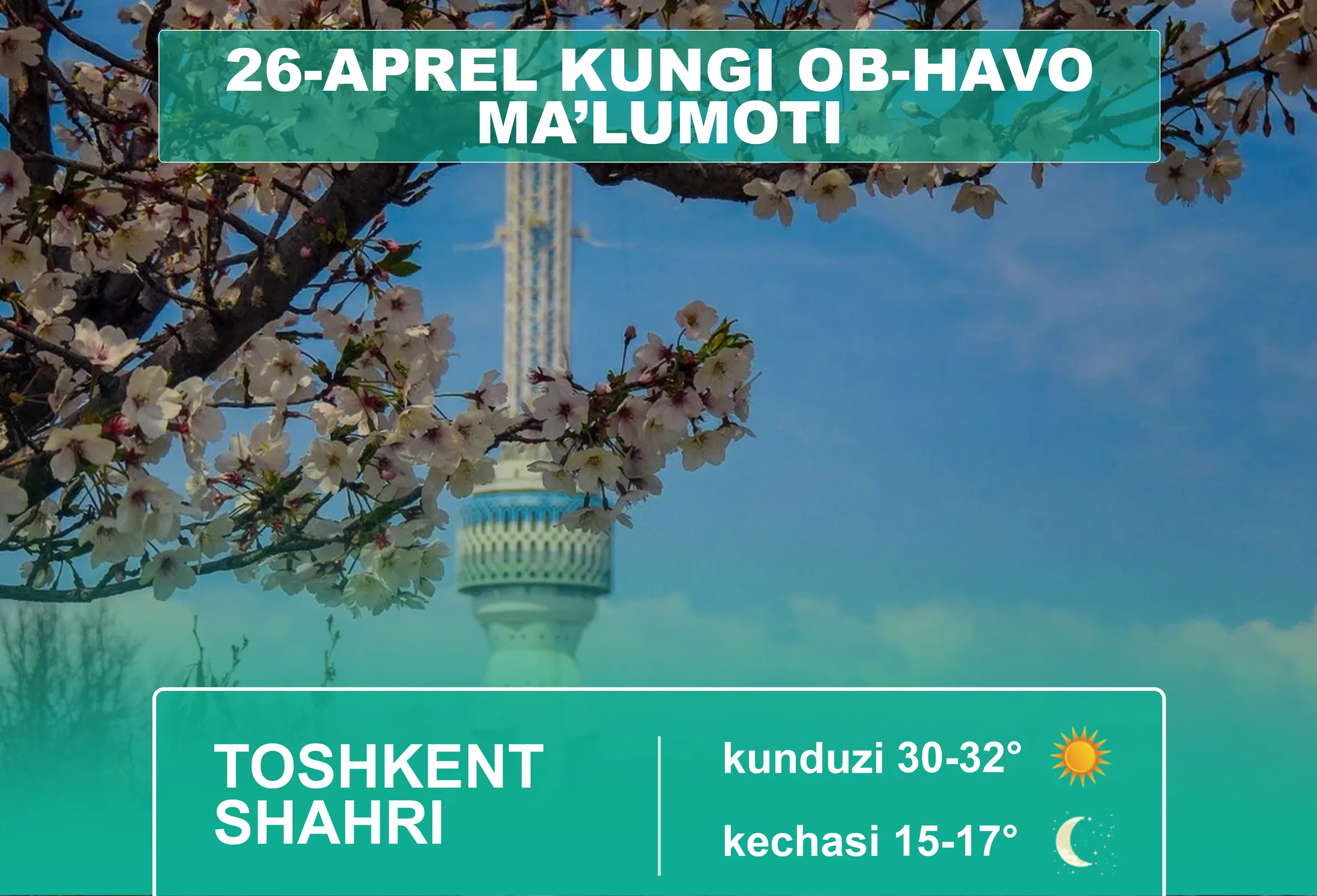 O‘zbekiston Respublikasi Gidrometeorologiya xizmati agentligining xabar berishicha, 26-aprel kuni Toshkent shahrida havo biroz bulutli bo‘ladi, yog‘ingarchilik kutilmaydi. Shamol sharqdan 3-8 m/s tezlikda esadi. Harorat kechasi 15-17 daraja, kunduzi 30-32 daraja bo‘ladi.