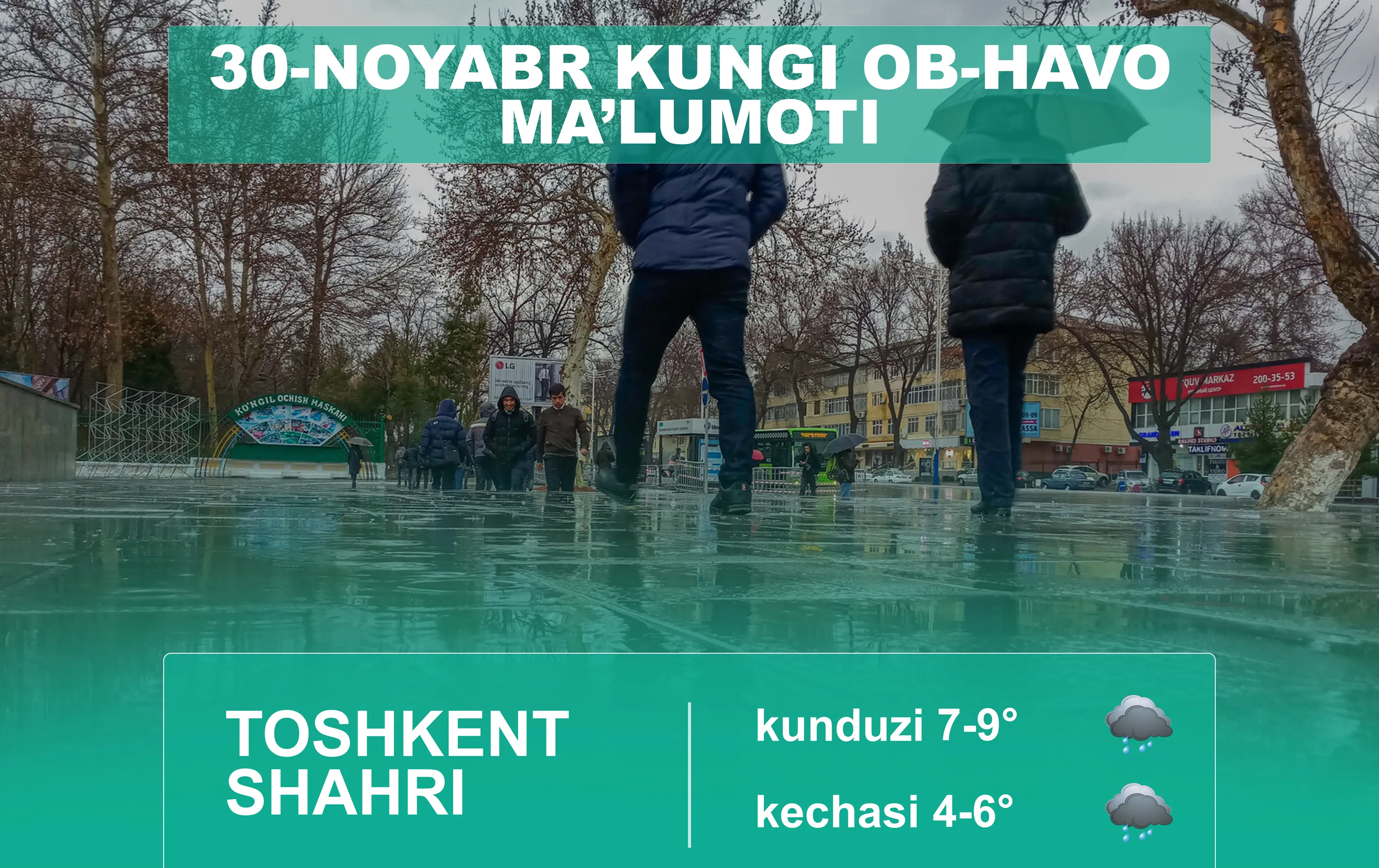 O‘zbekiston Respublikasi Gidrometeorologiya xizmati agentligining xabar berishicha, 30-noyabr kuni Toshkent shahrida havo biroz bulutli bo‘ladi, vaqti-vaqti bilan yomg‘ir yog‘adi. Shamol g‘arbdan 5-10 m/s tezlikda esadi. Harorat kechasi 4-6, kunduzi 7-9 daraja iliq bo‘ladi.