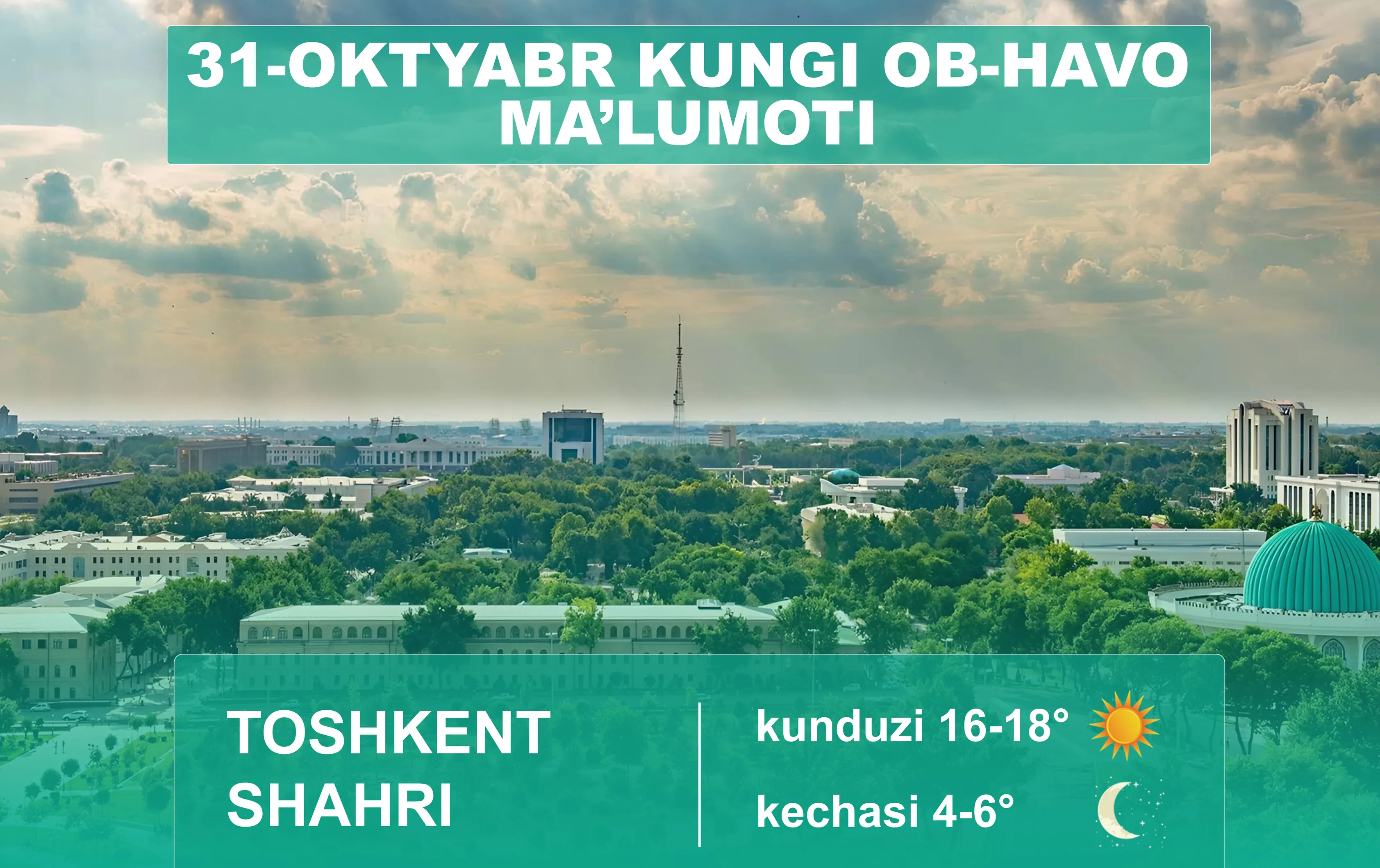 O‘zbekiston Respublikasi Gidrometeorologiya xizmati agentligining xabar berishicha, 31-oktyabr kuni Toshkentda havo biroz bulutli bo‘ladi, yog‘ingarchilik kutilmaydi. Shamol sharqdan 3-8 m/s tezlikda esadi. Harorat kechasi 4-6, kunduzi 16-18 daraja iliq bo‘ladi.