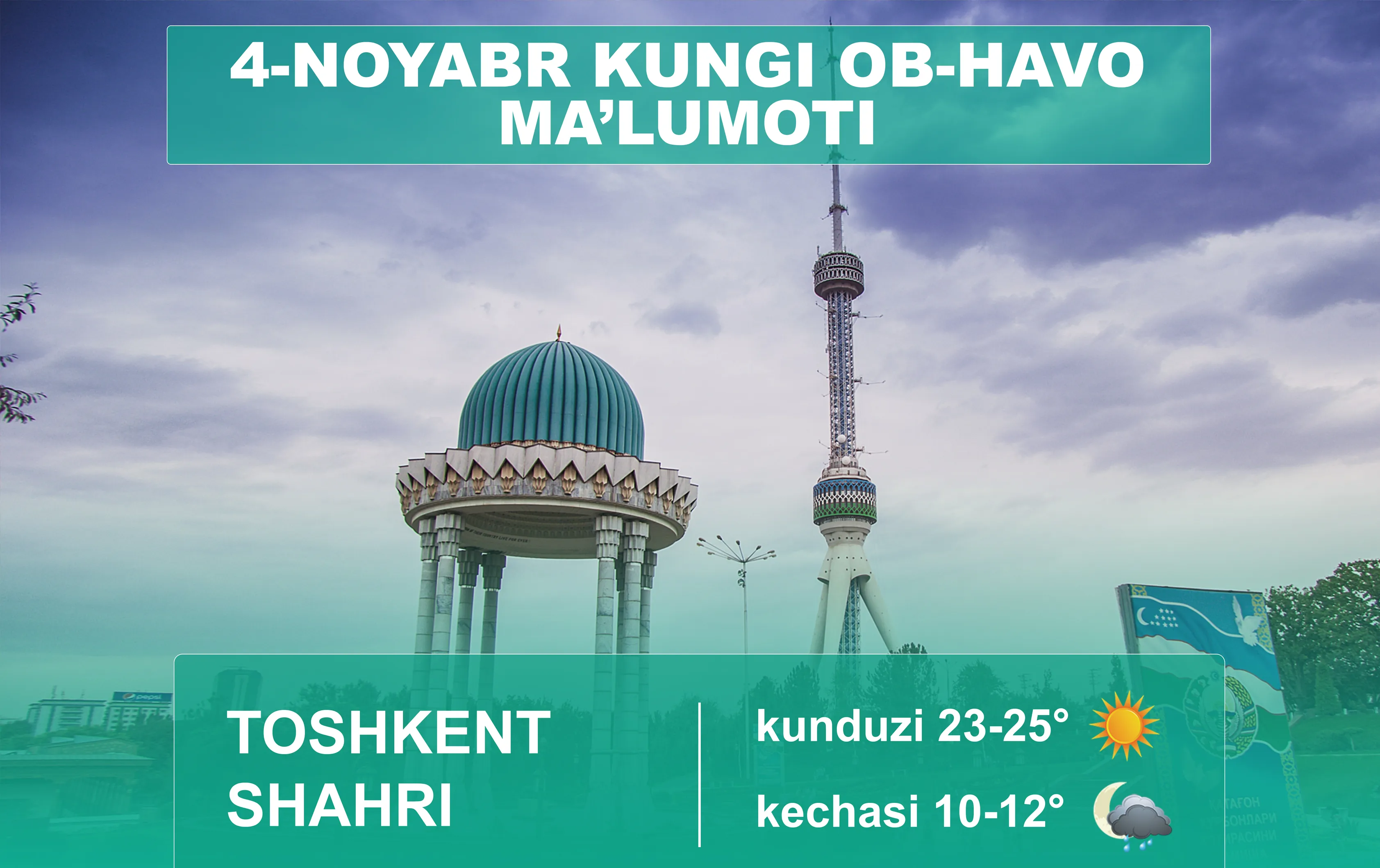 O‘zbekiston Respublikasi Gidrometeorologiya xizmati agentligining xabar berishicha, 4-noyabr kuni havo biroz bulutli bo‘ladi, kechga tomon yomg‘ir yog‘adi. Sharqiy shamol yo‘nalishini o‘zgartirib, g‘arbdan 5-10 m/s tezlikda esadi, kechga tomon 12-14 m/s gacha kuchayishi mumkin. Harorat kechasi 10-12, kunduzi 23-25 daraja iliq bo‘ladi.