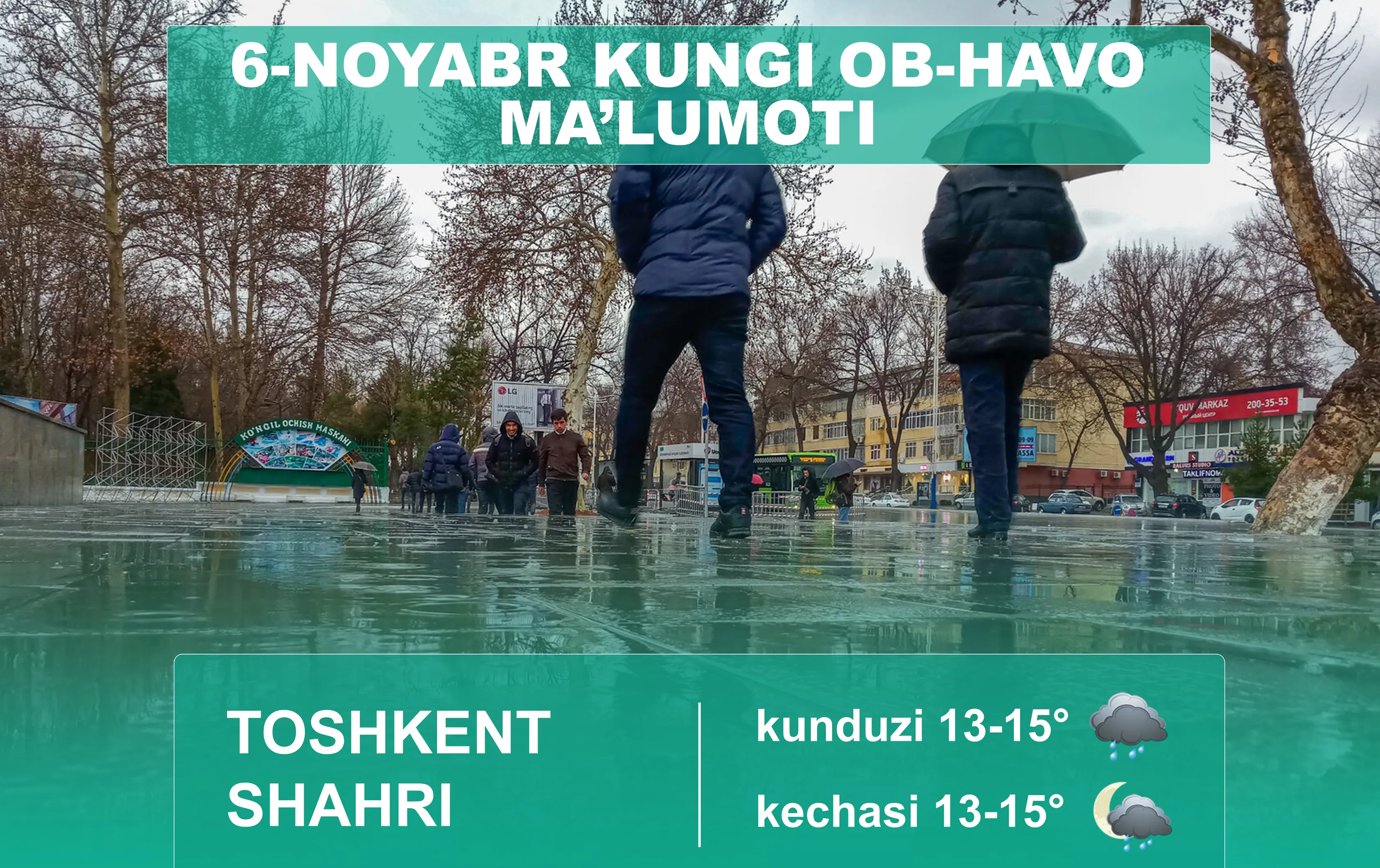 O‘zbekiston Respublikasi Gidrometeorologiya xizmati agentligining xabar berishicha, 6-noyabr kuni havo biroz bulutli bo‘ladi, yomg‘ir yog‘adi. Shamol g‘arbdan 5-10 m/s tezlikda esadi. Harorat kechasi va kunduzi 13-15 daraja iliq bo‘ladi.