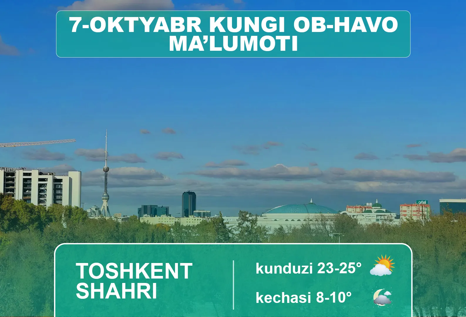 Toshkent, Samarqand, Jizzax va Sirdaryo viloyatlarida havo o‘zgarib turadi, yog‘ingarchilik kutilmaydi. Sharqdan sekundiga 7-12 metr tezlikda shamol esadi. Kechasi 8-13, kunduzi 20-25 daraja iliq bo‘ladi.