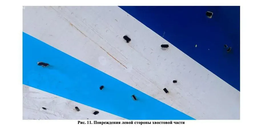 “Dastlabki tekshiruv natijalariga ko‘ra, samolyotning fyuzelyaji, dum qismi, vertikal stabilizatori, gorizontal stabilizatori, balandlik hamda yo‘nalish rulida turli o‘lcham va shakldagi teshiklar va boshqa turdagi shikastlanishlar aniqlandi. Xuddi shunday zararlanishlar chap dvigatel va chap qanotda ham topilgan”, – deyilgan hisobotda.