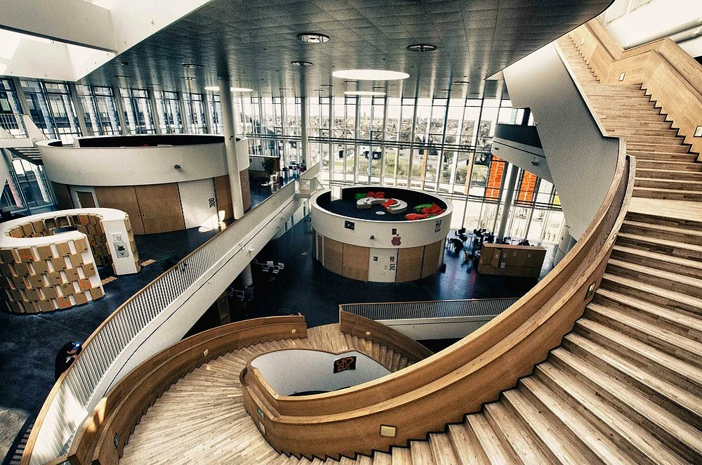 Maktab binosi ochiq hudud koʻrinishida boʻlib, oʻrtada katta zinapoyaga mavjud. Arxitekturaning bosh gʻoyasi pedagogika anʼanasiga qarshi tarzda oʻqitishga boshqacha usulda yonashish boʻlgan.