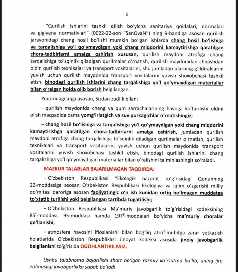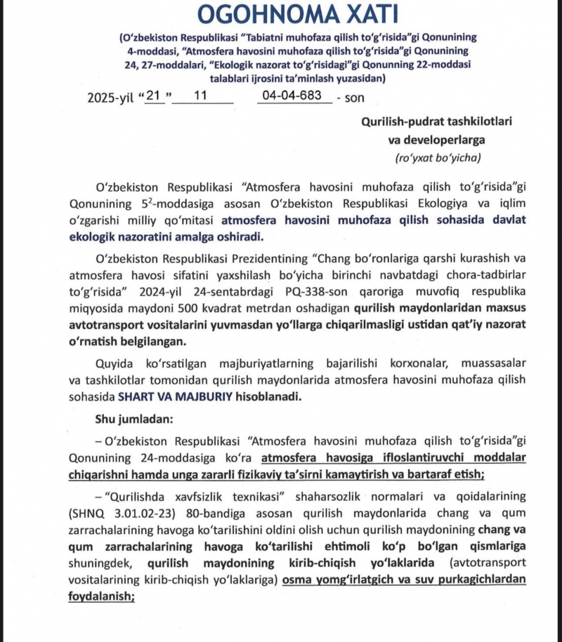 Ekologiya va iqlim o‘zgarishi milliy qo‘mitasi qurilish maydonlarida ba’zi talablarga amal qilinishi kerakligini eslatib, ushbu talablardan bo‘yin tovlagan qurilish tashkilotlari javobgarlikka tortilishi haqida ogohlantirdi.