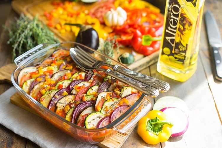 8. Masalliqlar ustidan bulgʻor qalampiri boʻlaklari sepiladi va ozroq yogʻ quyiladi.