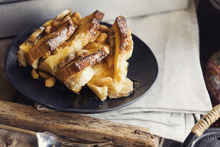 9. Non tuxumli qorishmani oʻziga singdirib olishi uchun masalliqlar shu holatda 10 daqiqa qoldiriladi. Keyin esa non ustidan yongʻoqlar sepib chiqiladi.