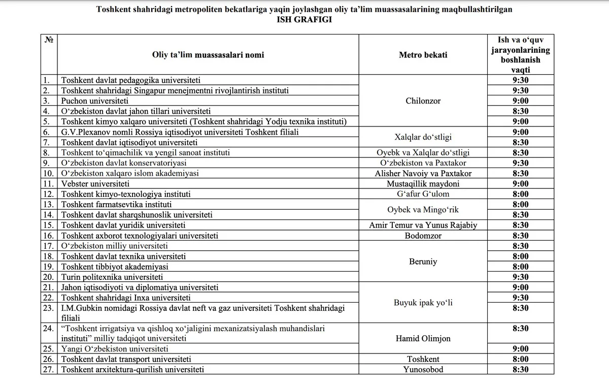 Toshkent shahar metropolitenida yo‘lovchi oqimini to‘g‘ri taqsimlash, talabalarning o‘z vaqtida dars mashg‘ulotlariga yetib borishlari uchun qulaylik yaratish maqsadida bekatlarga yaqin joylashgan oliy ta’lim muassasalarining maqbullashtirilgan ish grafigi tasdiqlandi. Bu haqda Oliy ta’lim, fan va innovatsiyalar vazirligi xabar berdi.