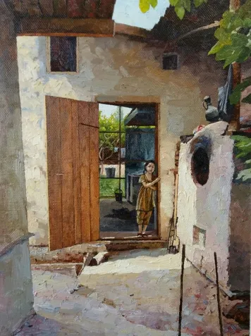 “Mol-qo‘ylarimizdan xabar olaylik-chi, issiqda qiynalib qolishmadimikan deb, qizimni yetaklab yura boshladim. Tandirxonadan o‘tayotganimizda tandirga tushib turgan quyosh o‘ziga tortdi, to‘xtadim. Avval bunaqa holatni yo kuzatmaganman, yoki e’tibor bermaganman. Balki ijodga, o‘z yo‘limni topishga bo‘lgan g‘alayon meni to‘xtashga undagandir. Joyni o‘rgana boshladim. U tomonga o‘tib qaradim, bu tomonga o‘tib qaradim, tandirga tushayotgan quyosh ko‘zimga shunaqa chiroyli ko‘rinyaptiki, ichimdan nimanidir topdim, qaysidir ishning bo‘sag‘asida turibman, degan fikr o‘tardi. Qizimni o‘sha yerdagi eshik oldiga o‘tkazib, “Qizim, bundoq turing, bu yoqdan kelgandek bo‘ling”, deb oxiri o‘sha eshikka suyangan holda to‘xtatib, kichkina qoralama qildim”, — deydi rassom.
