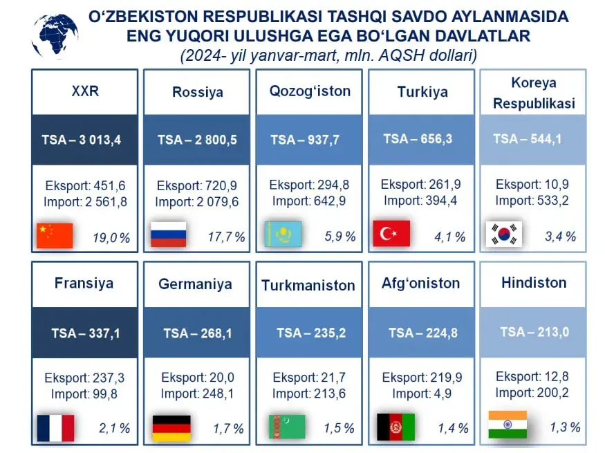 Statistika agentligining dastlabki ma’lumotlariga ko‘ra, 2024-yilning yanvar-mart oylarida O‘zbekiston Respublikasi tashqi savdo aylanmasida yuqori ulushga ega bo‘lgan hamkor davlatlar (AQSh dollarida):