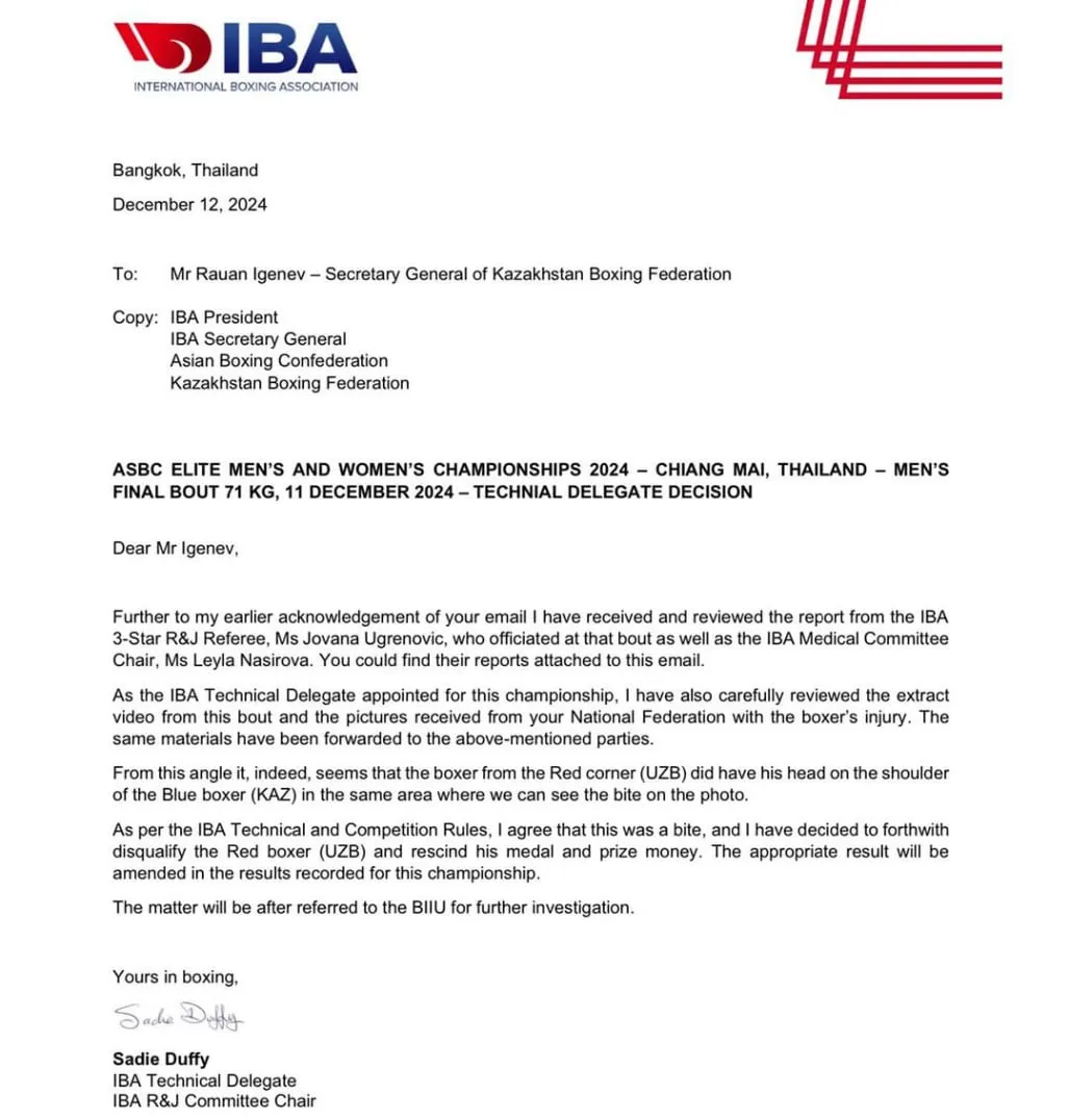 Ma’lum bo‘lishicha, erkaklar terma jamoamizning bitta oltin medali olib qo‘yilib, finalda yutqazgan qozoq bokschisi Ablayxay Jusupovga taqdim etilgan. -71 kg vazn toifasida Osiyo chempioni bo‘lgan hamyurtimiz Havasbek Asadullayev jang chog‘ida raqibining yelkasidan tishlab olgani uchun shunday qarorga kelingan.