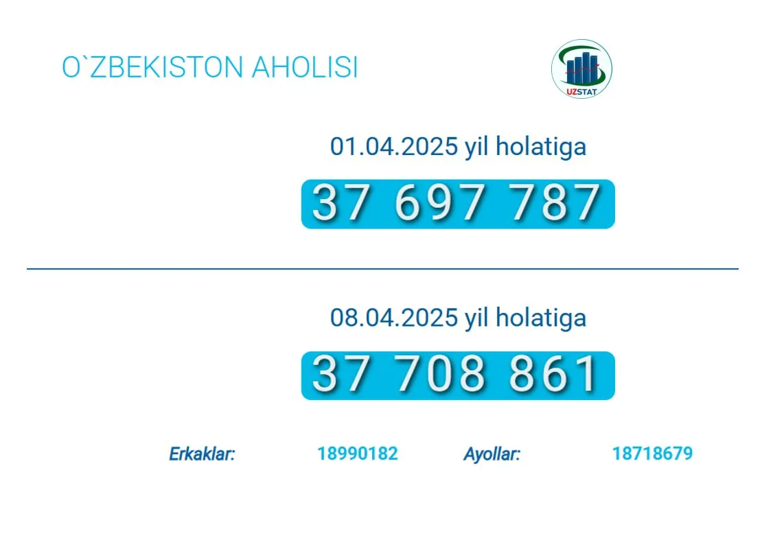 2025-yilning 8-aprel holatiga ko‘ra, O‘zbekistonning doimiy aholisi 37 708 861 kishini tashkil etmoqda. Bu haqda Milliy statistika qo‘mitasi xabar berdi.