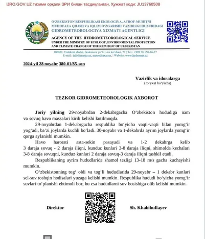 Ushbu xabarga ko‘ra, noyabrning so‘nggi ikki kunida respublikada nam havo, vaqti-vaqti bilan yog‘ingarchilik bo‘lishi, ayrim hududlarda kuchli yog‘ishi, dekabrning boshida hududlarda havo haroratining tunda nol darajadan pasayib ketishi mumkin.