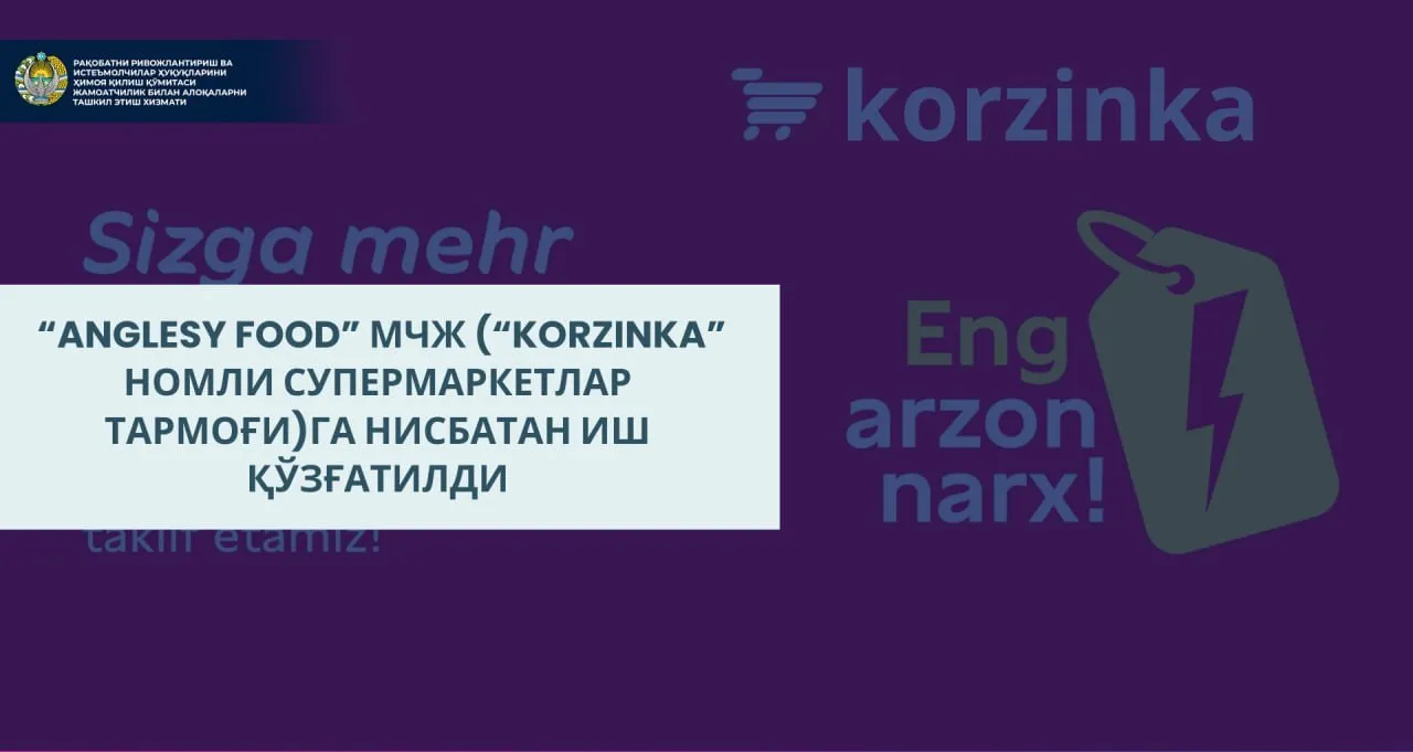 “Korzinka” supermarketlar tarmog‘i tomonidan turli xil usullarda tarqatilayotgan reklama axborotida “Kundalik xaridlarga eng arzon narx”, “Eng arzon narx - Korzinkada”, “...Eng unumlisiga keling!” degan reklamasida foydalanuvchilarni chalg‘itadigan yoki chalg‘itishi mumkin bo‘lgan so‘z jumlalaridan foydalanilganligi kuzatilmoqda. Bu haqda Raqobat qo‘mitasi ma’lum qildi.