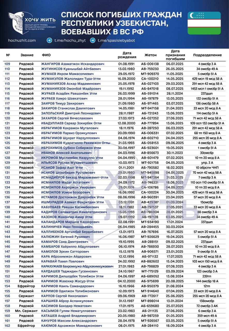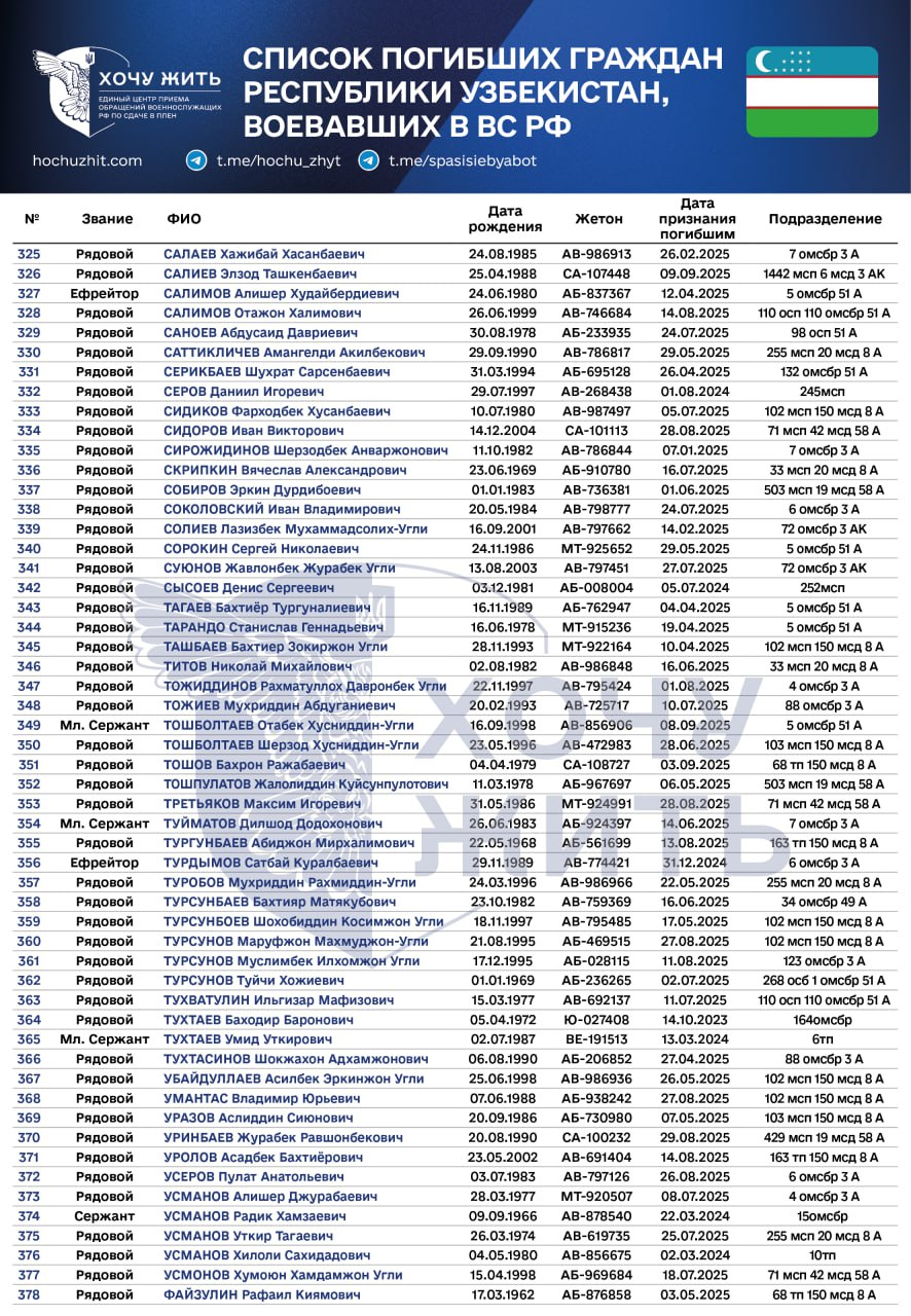 “Xochu jit” (yashashni istayman) tashkiloti Ukrainadagi urushda Rossiya armiyasi safida jang qilgan, halok bo‘lgan yoki bedarak yo‘qolgan o‘zbekistonlik fuqarolarning yangi ro‘yxatini e’lon qildi.
